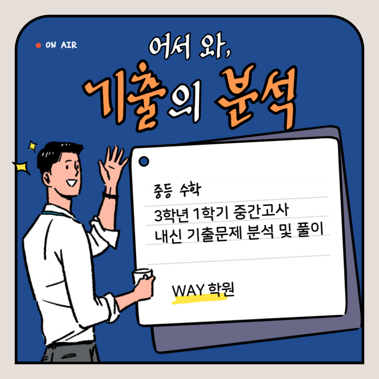 안녕하세요. WAY 학원입니다. 오늘은 울산 남구 신정중학교 3학년 1학기 중간고사를 분석해 보겠습니다. 시작해 볼까요~!! 첫 번째 문제 한 점의 위치에서 대응점의 위치를 찾는 문제가 출제되었습니다. 첫 번째 문제 풀이 대응점의 원리를 이용하여 B 점의 위치를 찾아보았습니다. 두 번째 문제 닮은 도형의 길이비를 이용해 선분의 길이를 찾는 문제가 출제되었습니다. 두 번째 문제 풀이 가장 짧은 길이를 기준으로 둘러싸인 변의 길이를 구하고 값을 비교해 보았습니다. 세 번째 문제 곱셈공식을 이용하여 식을 변형하는 문제가 출제되었습니다. 세 번째 문제 풀이 곱셈공식 중 합, 차의 공식을 이용하여 풀어 보았습니다. 네 번째 문제 제곱....... <img src="https://blogthumb.pstatic.net/MjAyNjAyMTBfMTMz/MDAxNzcwNzE2OTgzNzg5.F0lSenGqoPwL8ta9bIZw27pkpUA_8CNljcu4tVJDsg4g.4kHWZWs2E6BhRyrXu-Glhk80w_dwHbWfibhU4IWSCegg.PNG/%C1%DF3_%BD%C5%C1%A4%C1%DF.png?type=s3" />