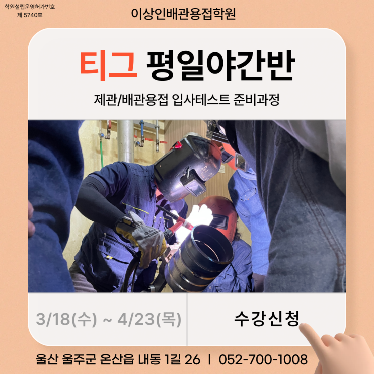 안녕하세요. 울산국비용접학원 이상인배관용접학원입니다. 설 연휴 잘 보내셨나요? 저는 군것질을 너~무 많이 했더니 살이 좀 쪘습니다! 모두 새해 복 많이 받으셨겠지요? 이제 날씨가 많이 따스해져서 봄이 오고 있는 것 같네요~ 자 그럼, 오늘은 3월 티그야간반 개강 소식을 전해드리도록 하겠습니다! 제관/배관용접 입사테스트 준비과정 3월 18일(수) ~ 4월 23일(목) 총 27일 90시간교육 평일(월~금) 18:30 ~ 21:50 티그(TIG)교육 과정으로 초보자/기량자 모두 훈련을 받으실 수 있습니다. 수업과정에는 파이프 맞대기 용접하기 수직 자세 용접하기 파이프 용접하기 용접부 결함 확인하기 6G자세 용접하기(전자세 교육가능)가 있습니다. 과....... <img src="https://blogthumb.pstatic.net/MjAyNjAyMjBfMTY5/MDAxNzcxNTU1Nzc1MjEz.EQafguJg5Er_Y08cPeh2Qfe1skty2GqruqcSa3xTwBMg.pQeTN-fHIiEmIFi-fs7Zc_Re-b_3daEviDr_l71r8jog.PNG/1.png?type=s3" />