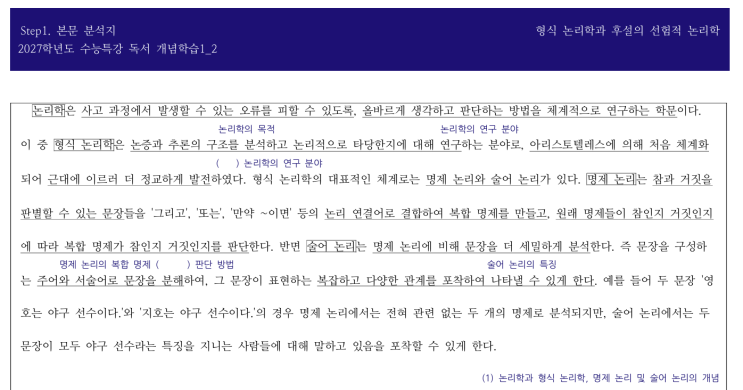 안녕하세요! 세종시 아름동 로운 국어 전문 학원입니다. 오늘은 '로운 국어 연구소' 채널에 추가된 자료를 소개해드리고자 게시글을 작성하게 되었습니다. 오늘은 2027학년도 EBS수능특강 비문학 독서 개념학습 1-2 형식 논리학과 후설의 선험적 논리학 해설 및 문제를 업로드 하였습니다. 해당 지문은 형식 논리학과 이에 대한 후설의 비판, 그리고 후설의 선험적 논리학에 대한 설명이 다뤄진 글입니다. 문단별 중심 내용은 다음과 같습니다. 1문단: 논리학과 형식 논리학, 명제 논리 및 술어 논리의 개념 2문단: 무모순성의 개념 3문단: 후설의 형식 논리학 한계 비판 및 선험적 논리학의 특징 해당 자료는 본문 분석지+복습용 괄호....... <img src="https://blogthumb.pstatic.net/MjAyNjAyMjBfMjQw/MDAxNzcxNTY1NTg4MDA1.d5TJrCwauznEIEKTgddp4U6_AYAGEqpZLqmIJ44uHd4g.DrCi0GdTahHcEEchco7vAlSGDBF2kQCDTp5DKoCRtlsg.PNG/%BD%BA%C5%A9%B8%B0%BC%A6_2026-02-09_114319.png?type=s3" />