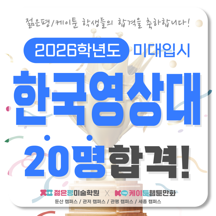 2026 젊은평X케이툰 학생들의 한국영상대학교 합격을 축하합니다 !! [방문 상담시간 안내] 화요일 ~ 금요일 14:00~22:00 토요일 10:00~17:00 전화상담 : 044)862-1238 <img src="https://blogthumb.pstatic.net/MjAyNjAyMjFfMzkg/MDAxNzcxNjQ1NDgyMDU3.3_2MJ7oSe4wyUhXszBaM2oKXObSwRjtQeDLD7sUUSrsg.Ey8sXC01g-pYNhwPr3peGy4fTOT8LenG-_kpT6SKtYsg.PNG/KakaoTalk_20260221_122935747.png?type=s3" />