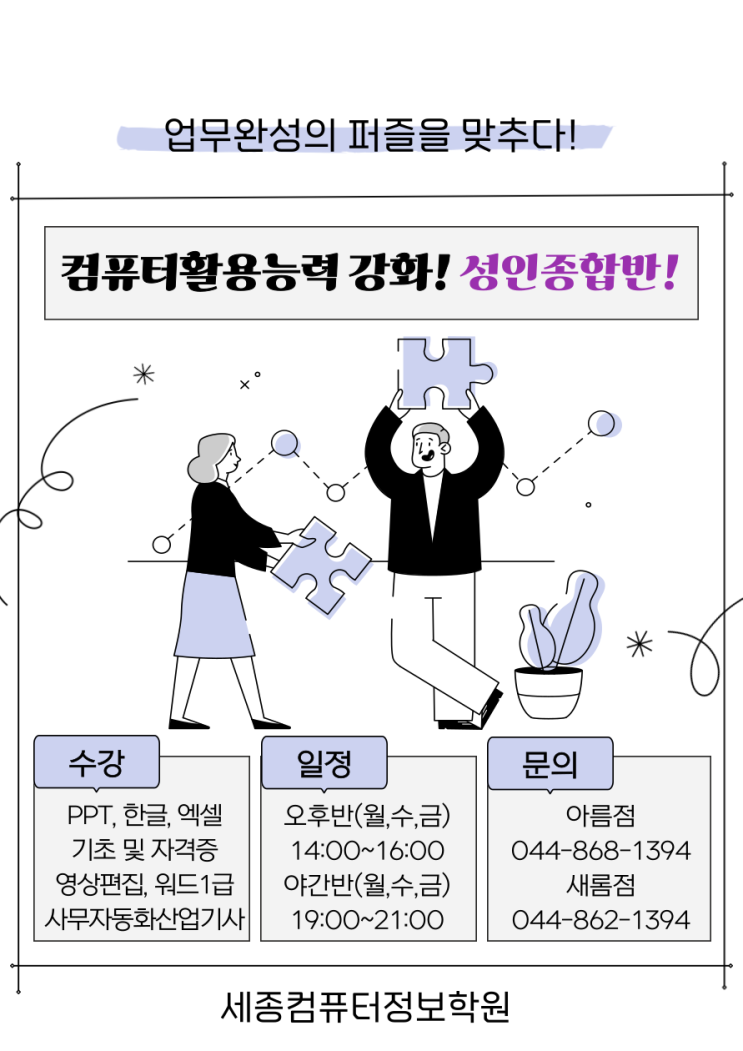 안녕하세요~ 세종시 IT전문교육기관 세종컴퓨터정보학원입니다^^ 업무 효율을 높이고 싶은 직장인부터~ 재취업을 준비하는 분들까지, 흩어진 실무 능력의 조각들을 하나로 모아 완벽한 '커리어 퍼즐'을 성인종합반 수강으로 완성하세요! 업무를 하다 보면 마주치는 막막한 순간들, 혹시 이런 고민을 하고 계시진 않나요? "엑셀 함수만 보면 머릿속이 하얘져요" "기획서는 좋은데, 파워포인트 디자인에서 막혀요" "자격증은 따고 싶은데, 혼자서는 진도가 안 나가요" 세종컴퓨터정보학원이 그 막막함을 확신으로 바꿔드립니다. 단순히 자격증 취득에만 급급한 수업이 아닙니다. 실무에서 바로 써먹을 수....... <img src="https://blogthumb.pstatic.net/MjAyNjAyMTJfMjE3/MDAxNzcwODYzNTI2ODI0.7sFmKqTvdW3ymIEz2lsD98Uc3swtv3Ywlf4cgVn63JUg.I8eVX7DzaKohI6d3jiWdkrIt7g5_1fFBx5ecq_Mc-8wg.PNG/%BC%BA%C0%CE-001_%2823%29.png?type=s3" />