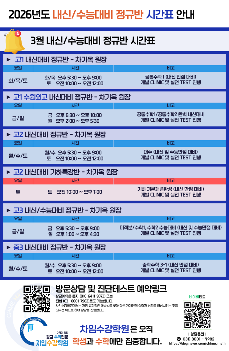 안녕하세요, 수학에 진심인 광교차임수강학원입니다. 새학기가 시작되고 이제 내신준비에 올인해야하는 시간입니다. 첫 중간고사는 특별히 중요하다는 사실, 다들 알고 계시지요? 광교 차임수강학원에서 3월 14일(토)에 내신대비 기하특강반을 개강합니다. 차기옥 원장님 직강으로, 자체 제작 교재를 가지고 완벽한 내신을 준비하는 기회, 여러분의 탁월한 선택이 될 것입니다. * 강좌명 : 고2 내신대비 기하특강반 * 강 사 : 차기옥 광교차임수강학원 원장 * 개강일 : 3월 14일 (토요일) 10:00 - 13:00 각 학년 진단평가 예약: 031-8001-7982 진단평가 및 학습플랜 상담예약: https://forms.gle/eomzGesWaJMWrxia9 <img src="https://blogthumb.pstatic.net/MjAyNjAzMTFfNjMg/MDAxNzczMjAzOTc3MjI5.RHRo_qTfG_31AMUxMucxpj3XRyv2-mte2LNKkV3lqf0g.2Z39ZminbYjUllaKjUI5AjgitvpezN3dh7DkjrFHjCog.PNG/0311_%BC%F6%C1%A4.png?type=s3" />