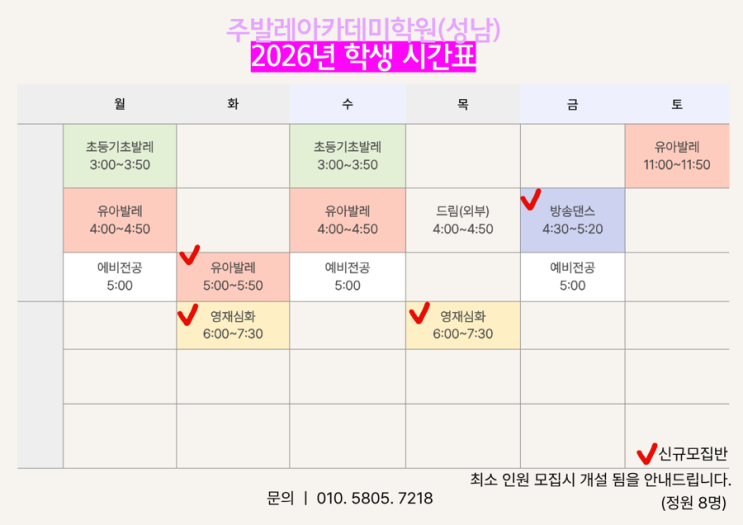 안녕하세요 주발레아카데미학원입니다. 초등학생 운동으로 최고인 발레! 무엇이 좋은지 알아볼까요?^^ 1. 거북목 교정에 효과적이고 바른 자세교정에 최고! 2.유연성향상, 섬세한 근육사용으로 부상위험이 적어진다. 3. 공부할때 뒷받침되는 체력키우기 까지 한번에! 아름다워지는 발레로 예비초등학생부터 중고등학생까지 체력과 성장기 바른 몸을 만들어주세요^^ 2026년 학생 시간표 안내입니다. 발레전문 교육기관으로 수강생한명 한명 바른 자세교정과 목표하는 바를 이루기위해 최선을 다합니다. -바가노바메소드 교육 -발레단 수석무용수 출신 원장직강 ✔️주발레아카데미 문의| 010.5805.7218 ✔️카카오채널 문의| 주발레아카데미 #분당....... <img src="https://blogthumb.pstatic.net/MjAyNjAxMDZfMTAy/MDAxNzY3Njg3MzA5NDQz.089uxSCbT3BZWdda0A_GUw-AwtLIOGtNpAJCibSz6wgg.VKlC0yQkSbQ810KSp6ZuU84JilW4BNcZjVWm6pCceZkg.PNG/Untitled_design_1.png?type=s3" />
