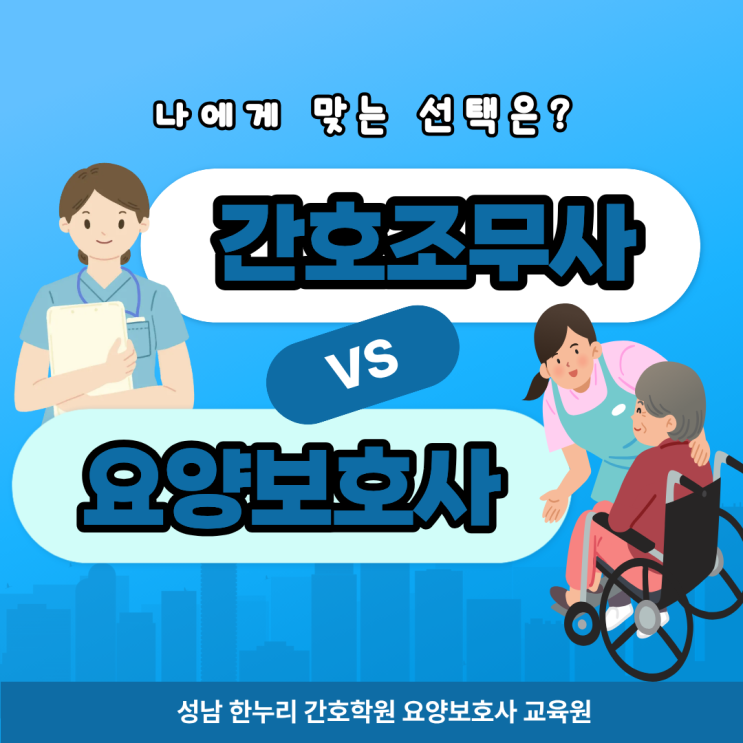 안녕하세요. 성남 한누리 간호학원입니다. 요즘 경기가 어렵다보니 전업주부로 아이를 키우는 분들도 다시 취업해볼까 하고 취업전선에 많이들 뛰어들고 계시는데요. 특히 그중에서도 #간호조무사 자격증과 #요양보호사 자격증은 경력단절된 주부님들께서 다시 도전하시기 좋은 자격증입니다. 그렇다면 요양보호사와 간호조무사 중 어떤 자격증이 더 좋을까요? 많은 분들의 상담을 진행하면서 이 질문을 받을 때마다 저는 잠시 숨을 고르게 됩니다. 왜냐하면 이 질문 속에는 단순히 간호조무사 자격증과 요양보호사 자격증의 비교가 아니라, 앞으로의 삶을 어떻게 다시 시작할지에 대한 진지한 고민이 담겨 있기 때문입니다. 다시 일을 시작해야....... <img src="https://blogthumb.pstatic.net/MjAyNjAxMDdfMTc3/MDAxNzY3NzgwOTM4ODU2.eViC8Nx06mYXefgcoVQ7I1uo8qw82yAFPA7zV_k0DVgg.Rs9fLtkzK0bKRhovAD2i4p3lhjJT-a_7kE3RuinMI_Ag.PNG/1.png?type=s3" />