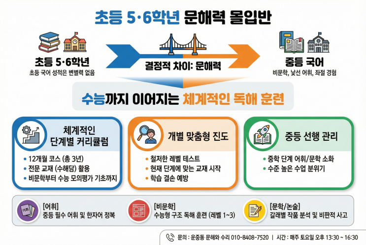 문해력 전문 학원 문해와수리에서 초등, 중등 신규생을 모집합니다! 1. 대상 : 초등 5,6 학년 / 중등부 2. 시간 : 매주 토요일 10시, 13시30분 (그 외 시간은 별도 문의부탁드립니다) 3. 주1회, 3시간 문해력 전문 코치 출신의 소수정예 몰입수업 4. 신청방법 : 아래 경로로 테스트 및 상담 신청해주시면 됩니다. ▶입학시험 신청지 : https://shorturl.at/FTf2M ★문해와수리 프로그램 안내 (아래 링크 클릭!) https://cottony-bandana-1ae.notion.site/2026-2dceded6aa2a80049b57c81e0344bab3?source=copy_link ★유선상담 : 010-8408-7520 (평일 오후 2시30분 이후 언제든 편히 연락주세요.) ■초등 문해력 몰입반 ■중등 국어 통합 집중....... <img src="https://blogthumb.pstatic.net/MjAyNjAyMjBfMjEy/MDAxNzcxNTg3MjI0NTUx.w1hkaEVJdFhi4U_PK02JH2FV3rsoSTqg6P65xDBAFk0g.w3z_nul5lo41eaquZGpbdgwwJDggtjqTCrKOj8byYaAg.PNG/1771557699450f6f1b9cb17d3ccf2a2c8b780b95f97b7.png?type=s3" />