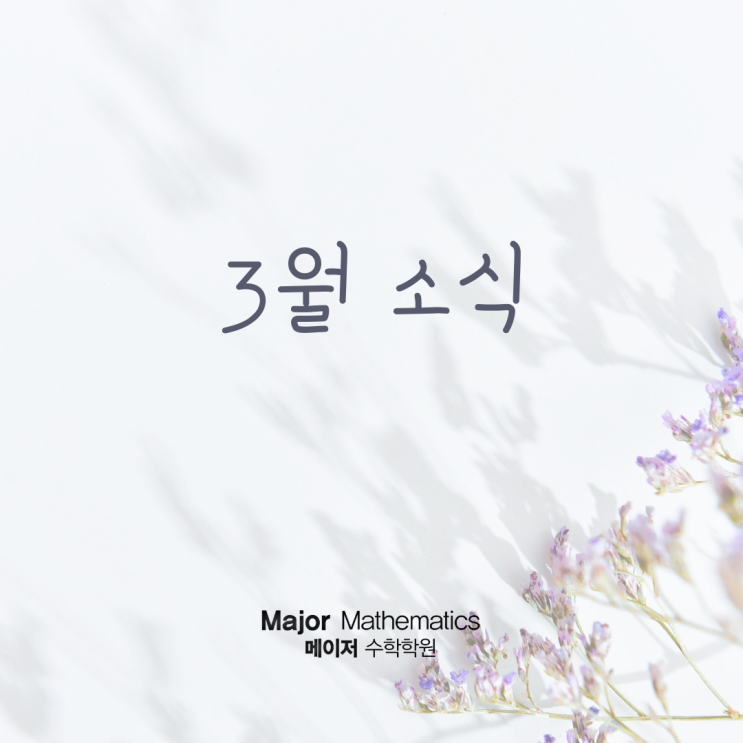 새로운 학년, 새로운 학기 모든 학생들이 잘 적응하고 열심히 공부하길 바랍니다! 메이저수학학원 3월 소식 알려드립니다. 상세일정은 아래 링크에서 확인해주세요! ① 3월 설명회 현재 초등학생이 보게 될 수능은? 3월 24일(화) 오전 11시, 김찬엽 부원장 ① 국교위 공교육혁신 보고서 해체분석 ② 여러 가지 교육뉴스 읽는 법 수포자 40% 시대, 포기하지 않으면 이긴다 3월 25일(수) 오전 11시, 박상빈 선생님 ① 고2때 갑자기 수포자가 급증하는 이유 ② 내 아이만큼은 "40%" 안에 들지 않는 로드맵 특목자사고, '가본 사람'이 길을 압니다 3월 26일(목) 오전 11시, 홍인철 원장 ① 특목 자사....... <img src="https://blogthumb.pstatic.net/MjAyNjAyMjBfMjM0/MDAxNzcxNTUxOTA4NjQ2.qknjWRi91ONHmMJ2jdUOkA1odiucZ_ZF0Ye-6lrnXHIg.ng7qT4-RYZmHUFeAh0ch2kqxfx_dH-9lnCYtSDKowU0g.PNG/3%BF%F9%BC%D2%BD%C4.png?type=s3" />