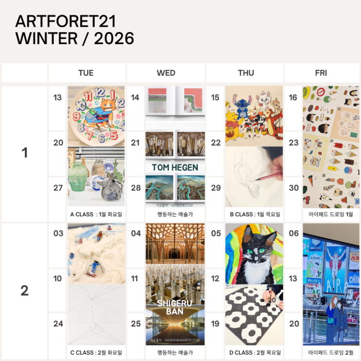 겨울방학 오전 특강 화~금 11시 ~ 12시 30분 (월 3회 구성, 97,500원) 1. Winter Art class ■ 교육일 Aclass : 1월 화요일(13,20,27) Bclass : 1월 목요일 (15,22,29) Cclass : 2월 화요일 (3,10,24) Dclass : 2월 목요일 (5,12,19) ■ 시간 : 오전 11시 ~ 12시 30분 ■ 대상 : 비 수강생 및 신규 수강생 ■ 작업내용 : 24, 25년 원내에서 수업 했던 내용들로 26년 정규 수업에는 진행하지 않을 프로그램입니다. 아이들에게 유익하고 몰입이 잘 되었던 내용들로, 방학 중 단기간 집중해서 미술 교육이 필요한 친구들에게 권합니다. (미술사와 현대미술, 회화 드로잉 중심으로 구성) ■ 교육비용 : 3회 97,500원 ■ 신청방법 네이버 예약으로 A~D....... <img src="https://blogthumb.pstatic.net/MjAyNTEyMTdfMTM4/MDAxNzY1OTM4OTE5MDIw.cZTweoEkd9SZnBZPZkJb824i5utB4WGd91TFqmMHhMYg.ZG4H8kjK8WU5yQLN5S491g4thQ9-3SQDH6diyKR6QXkg.PNG/900%A3%DF2%A3%DF20251217%A3%DF113424%A3%DF0001.png?type=s3" />