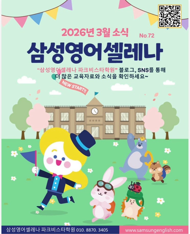 안녕하세요 삼성영어 셀레나 파크비스타학원입니다. 새로운 학년이 시작되는 초봄, 아이들의 설렘과 성장을 담은 3월 소식지 전해드립니다. 낯선 교실, 달라진 교과 과정 속에서도 아이들은 하루하루 영어의 리듬을 다시 만들어가도록 하겠습니다. 영어는 단번에 완성되는 결과가 아니라 매일의 작은 반복 속에서 자라는 힘이라고 믿습니다. 3월은 ✔ 학습 루틴을 안정적으로 잡고 ✔ 새 학년 교과 연계를 준비하며 ✔ 말하고 표현하는 자신감을 다시 세우는 시간입니다. 아이 한 명, 한 명의 속도를 존중하며 함께 고민하고, 함께 준비하는 파크비스타가 되겠습니다. 늘 믿고 맡겨주시는 부모님께 진심으로 감사드립니다 따뜻한 봄처....... <img src="https://blogthumb.pstatic.net/MjAyNjAyMjRfMTQz/MDAxNzcxOTM4OTI4OTA5.GJI9598HYZNWngZBl5clFHCfIEHrx5VDq1-3ax9szPkg.96VBKVnx85HQQtJ_AipvwO0eCzvLC7WK49U0Soot-igg.JPEG/IMG%A3%DF0357.jpg?type=s3" />