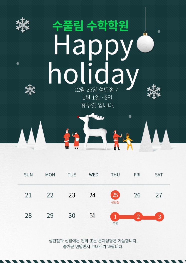 1/1~1/3 학원 방학 12/31 특정반 휴강 있습니다. 학원방학 기간 중 전화 또는 문자상담 가능합니다. 즐거운 연말연시 보내시기 바랍니다. <img src="https://blogthumb.pstatic.net/MjAyNTEyMjNfMTEz/MDAxNzY2NDg3ODYwNDk3.J9j7xtY7r1knuaibGkJkmIuQZw7K4wIfabO6rNhH-3sg.CGmqlMbt8oSUcEl0BZQS9uov4CBfD4cK2LvK9qKEJocg.JPEG/%C1%A6%B8%F1%C0%BB-%C0%D4%B7%C2%C7%D8%C1%D6%BC%BC%BF%E4_-001_%2832%29.jpg?type=s3" />