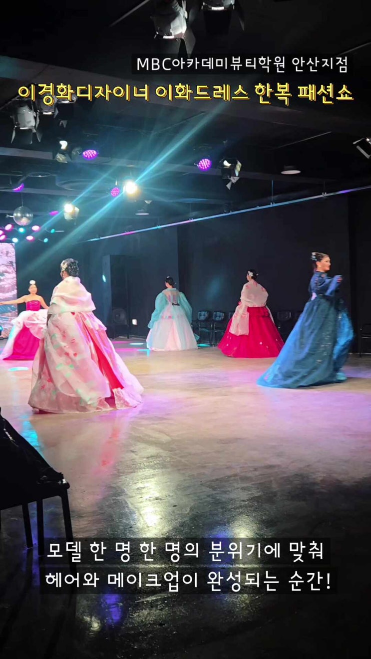 #안산미용학원 안녕하세요! MBC아카데미뷰티학원 안산지점입니다. #안산미용학원 오늘은 12월에 진행했던 행사! 이경화디자이너님의 '이화드레스' 한복패션쇼 현장이야기를 전해드리려고 합니다. 안산미용학원에서는 단순 기술만 배우는 것이 아니라 다양한 현장경험을 할 수 있도록 기회를 제공해드리고 있습니다. 사람응대 하는 법 부터 현장 분위기 적응, 시간 관리, 의상컨셉에 맞는 스타일링 분석 이러한 부분들이 실제 무대와 현장에서 길러집니다. #안산미용학원 그래서 안산미용을 선택할때 현장 실습 기회가 얼마나 많은지는 정말 중요한 기준이 됩니다. 이번 디자이너 패션쇼에서도 전통미와 현대감각이 어우러진 특별한 무....... <img src="https://phinf.pstatic.net/image.nmv/blog_2025_12_22_732/AcAKHq5KNZ_03.jpg?type=f480x480" />