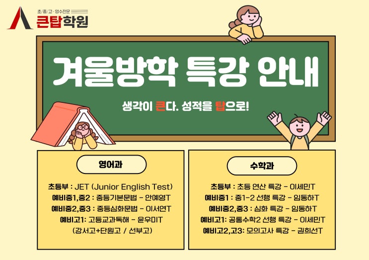 선부동 영수학원 큰탑학원 겨울방학 특강으로 새 학기 성적 1등급 예약하기!