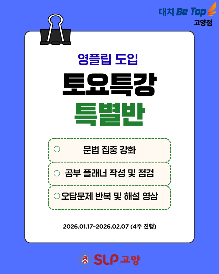 토요특강 후기|영플립 첫 도입, 관리형 학습의 시작 안녕하세요. 고양 SLP입니다. 예비 6학년과 예비 중1학년 학생들을 대상으로 영플립을 처음 도입한 토요특강 특별반을 4주 과정으로 운영하게 되었고, 그 결과를 이렇게 공유드리려고 합니다. ✔ 영플립, 단순한 시험 시스템이 아니에요 영플립은 단순히 ‘온라인으로 시험을 보는 시스템’이 아닙니다. 저희는 영플립을 학원에서 함께 만들어가는 학습 문화라고 생각합니다. 그래서 수업 안에서 ☞선생님의 개념설명 ☞스스로 문제 풀기 ☞오답문제 확인 ☞오답 해설 강의 듣기 ☞집에서 오답 문제 풀어보기 ☞성취도 관리 이 모든 과정을 아이들과 함께, 하나의 흐름으로 만들어....... <img src="https://blogthumb.pstatic.net/MjAyNjAyMTBfMjcg/MDAxNzcwNjk4ODQyNzA2.aGSnaYjAViPEfVgdeH_4ntAHlMRoyFK2o82-NWTIXkwg.a9-BOEpHR5UkCbKZ7Rst7jNXWcg03-Ac75vVL9D3g4kg.PNG/%C7%D9%BD%C9_%C4%DB%C4%DB.png?type=s3" />
