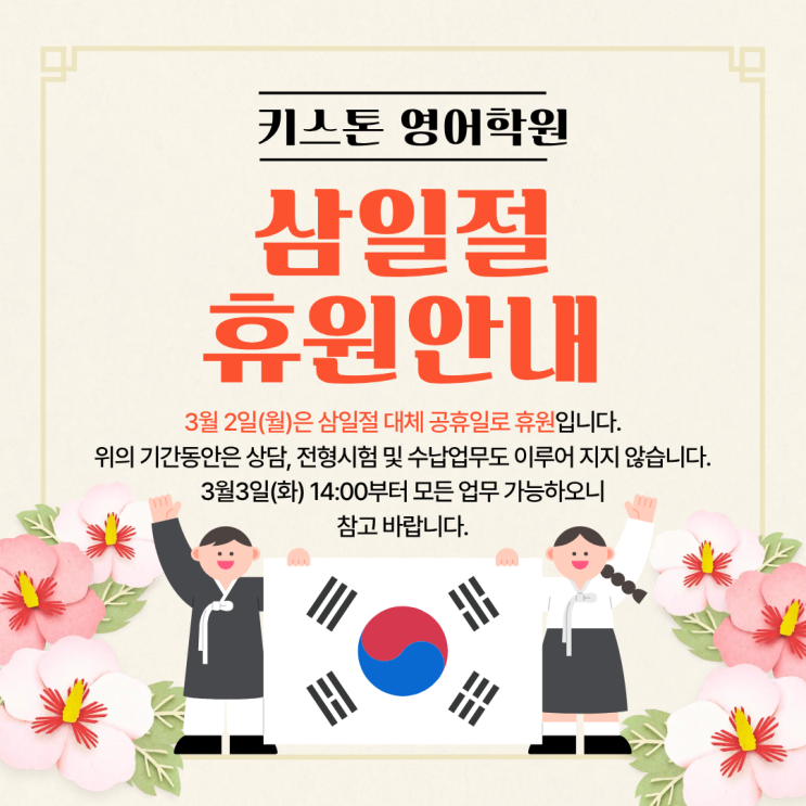 2026년 3월 2일(월)은 삼일절 휴원 입니다. 위의 기간동안은 상담, 전형시험 및 수납업무도 이루어 지지 않습니다. 3/ 3(화) 14:00부터 모든 업무 가능하오니 이점 참고 부탁드립니다. 감사합니다. <img src="https://blogthumb.pstatic.net/MjAyNjAyMjdfNDUg/MDAxNzcyMTgxMjU1MzY3.G_P8ouOpbP-W3j0s_JWmR4FEeZ6rbqBYR-UloZQjfEEg.kLM8N301zuMCl1F1UGHhl-d2MImAluasW4F0KBiLDukg.PNG/%C1%A6%B8%F1%C0%BB_%C0%D4%B7%C2%C7%D8%C1%D6%BC%BC%BF%E4._%282%29.png?type=s3" />
