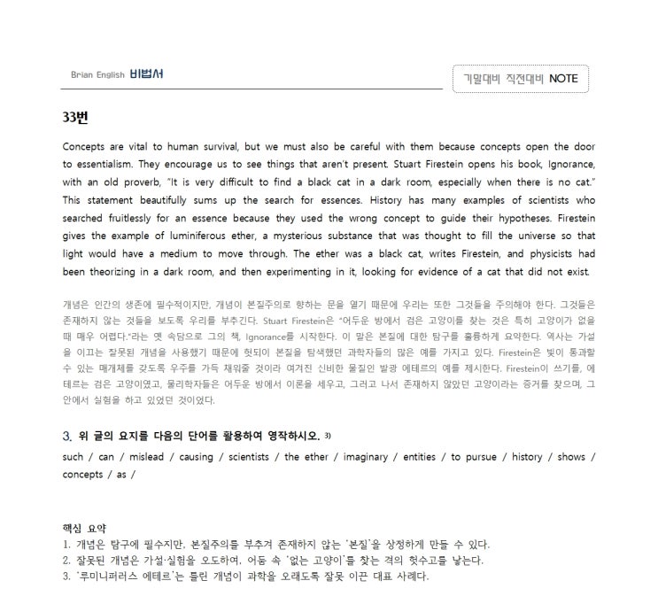 고등영어 시험은 학생의 1. 실력과 2. 학습량 + 3. 학습내용의 시험 적합성에 따라 성적이 좌우됩니다. 실력과 학습량은 알겠는데 시험적합성은 뭐지? 이런 의문이 들 수 있습니다. 이제 많은 분들이 단순 암기의 시대는 지났다. 이런 말은 많이 들어보셨을 거에요. 그럼 시험 범위 '지문'을 제대로 모르고 들어가도 되는가?? 그건 아닙니다. 지문을 세세하게 암기하는 건 불필요하고 시간만 잡아먹는 과업이라면 지문의 1. 핵심 요지 2. 내용의 전개방식 3. 주제 관련 어휘의 쓰임 이 세가지가 시험에 필요한 학습내용이고 이 내용을 '숙지'해야지만 고득점의 기반이 마련되게 됩니다. 지문 내용 숙지? 어떻게 할 수 있을까....... <img src="https://blogthumb.pstatic.net/MjAyNTEyMTRfNDUg/MDAxNzY1NjkyODE2ODU1.Z__gNehAuY1bJmo0_o10vTMpY1a6DmS-gpy21Y14rlIg.URrEkFNRB0x9p6aPH7JzsZyxoTJeIYDnC8cM9IXJny0g.JPEG/image001.jpg?type=s3" />