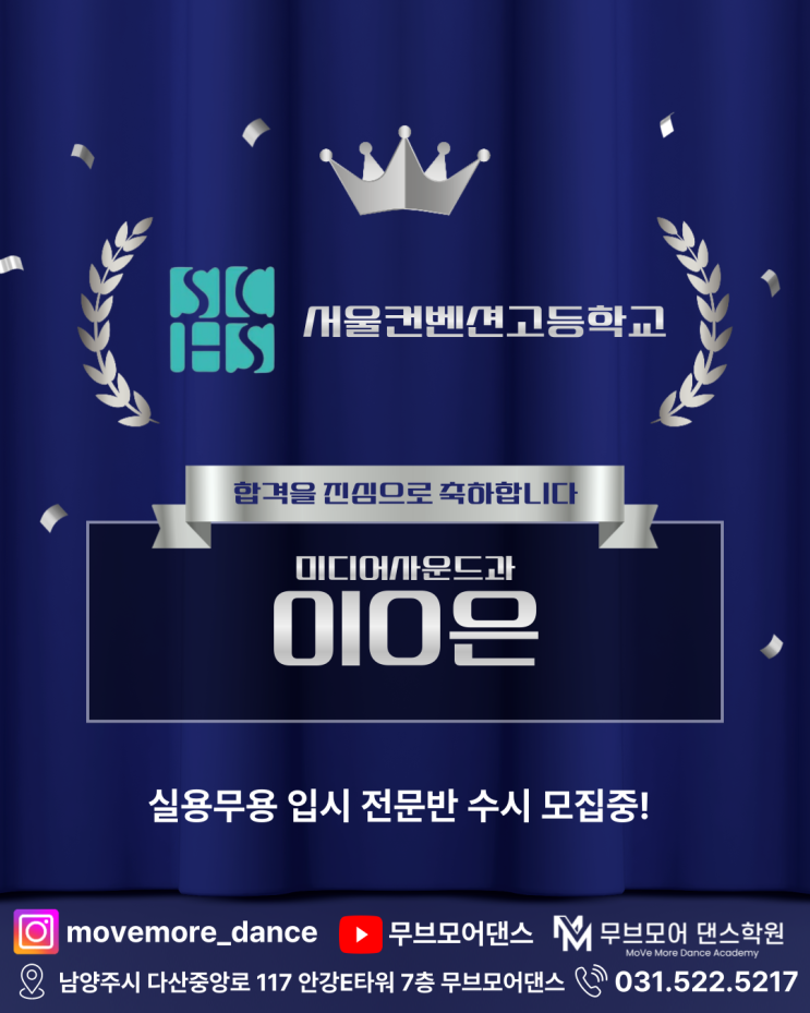 [다산댄스학원] 2026학년도 예고 입시 합격 현황, 입시 작품 영상 안녕하세요!! #다산댄스학원 #무브모어댄스 입니다! 저희 #다산댄스학원#무브모어에서 예고입시생들이 당당히!! 2026학년도 예고 입시 합격 소식을 전해주었습니다 정말, 진심으로 축하합니다 입시 결과를 전하는 이 순간이 저희에게는 언제나 가장 벅찬 순간입니다!! 그 과정이 얼마나 쉽지 않은지 잘 알기에 지금 먼저 떠오르는 말은 역시 “정말 고생 많았다” 라는 말인 것 같아요~~ 입시는 실력만으로 버티는 시간이 아니라 마음까지 함께 단단해져야 하는 시간입니다. “내가 과연 할 수 있을까” 라는 스스로를 의심했던 그 모든 순간을 지나 끝까지 포....... <img src="https://blogthumb.pstatic.net/MjAyNTEyMTdfNiAg/MDAxNzY1OTYyMTY0NDcw.9xDBCCYIPSLf_z4OgyOxVPRDzPp0H8srmNfxE2l9KSkg.LOKS0RyTZ9b6idMZdHdcTeXQ2dZryGOM4YSuHSFbcUQg.PNG/%C1%A6%B8%F1%C0%BB-%C0%D4%B7%C2%C7%D8%C1%D6%BC%BC%BF%E4_-002_%281%29.png?type=s3" />