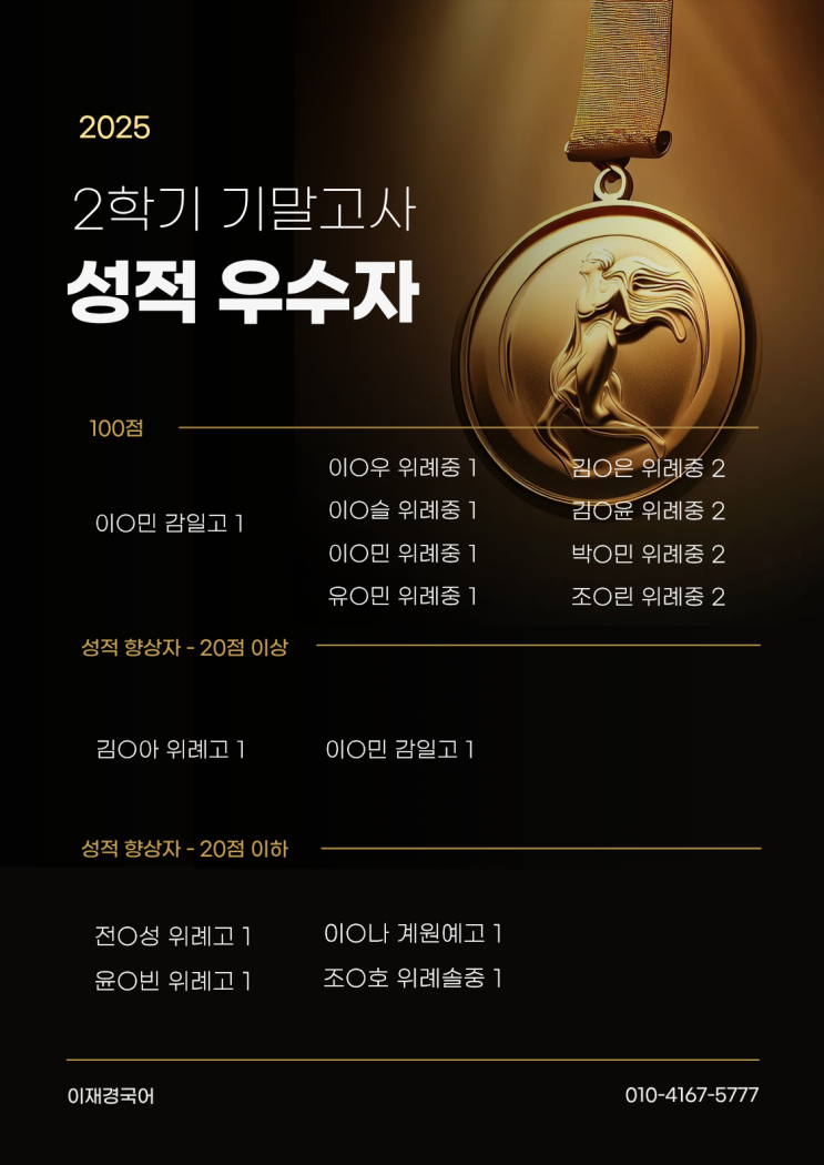 안녕하세요.^^ 위례 국어의 중심 [이재경국어교습소] 원장 이재경입니다. 드디어 2학기 기말고사가 모두 끝났습니다. 최선을 다 해준 모든 학생들에게 박수를 보냅니다. 궁금하신 점 있으시면 ☎ 010-4167-5777으로 연락주시기 바랍니다. 감사합니다~^^ <img src="https://blogthumb.pstatic.net/MjAyNTEyMjhfMTQ1/MDAxNzY2ODk3NTgwMDE2.U6NWZCqIJyEdPFIwgnHzn6JMhLQBBjGTpT8EP10M8ysg.6UpDYaajLavlYMLsfDm3i4j6em_t2a4CyXqAn3KN_iMg.PNG/%C1%A6%B8%F1%C0%BB_%C0%D4%B7%C2%C7%D8%C1%D6%BC%BC%BF%E4._%282%29.png?type=s3" />