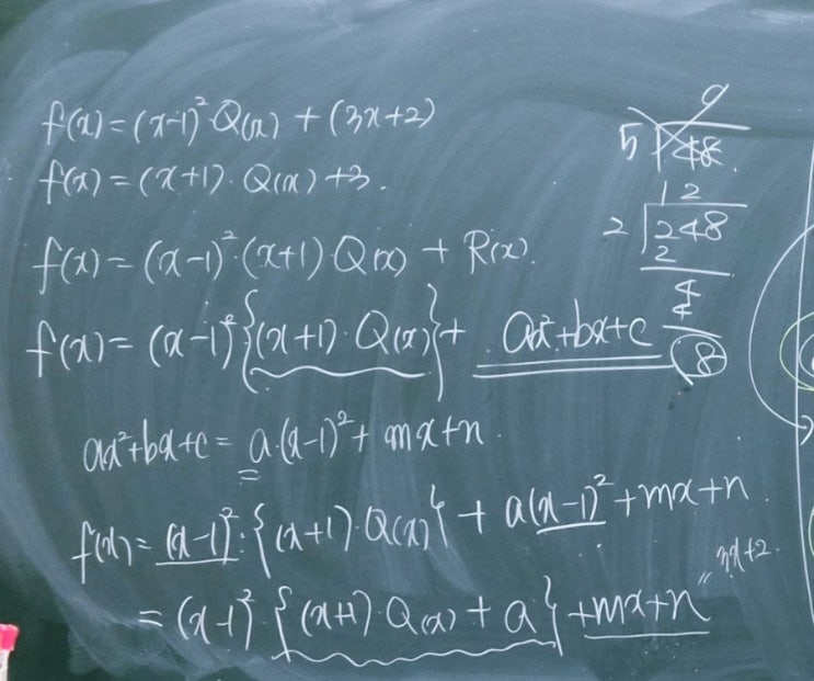 지난 주에 우리 예비 고1이들과 나머지정리 '삼차식으로 나누는 경우'를 공부했습니다. 문제 풀이에 들어가기 전 개념과 '왜' 그렇게 되는지를 먼저 알아야죠. 중학교 때와 너무 달라져버린 긴 수식에 정신 차리기가 힘들어도 바짝 집중하며 이해가 될 때까지 하고 또 합니다. 너무너무 중요한 고1 수학도 수학의숲에서 같이 준비합니다.♡ <img src="https://blogthumb.pstatic.net/MjAyNTEyMjhfMTUy/MDAxNzY2OTA4MTA1MTA4.3xYnGqhGXrJELGb2HEYbotkDYLQFKLMqcNifigerNOAg.5a4ow4KniE40hF2wszJXHq6Dxrb3r5wj11x23EjUUl8g.JPEG/900%A3%DF1766908104076.jpg?type=s3" />