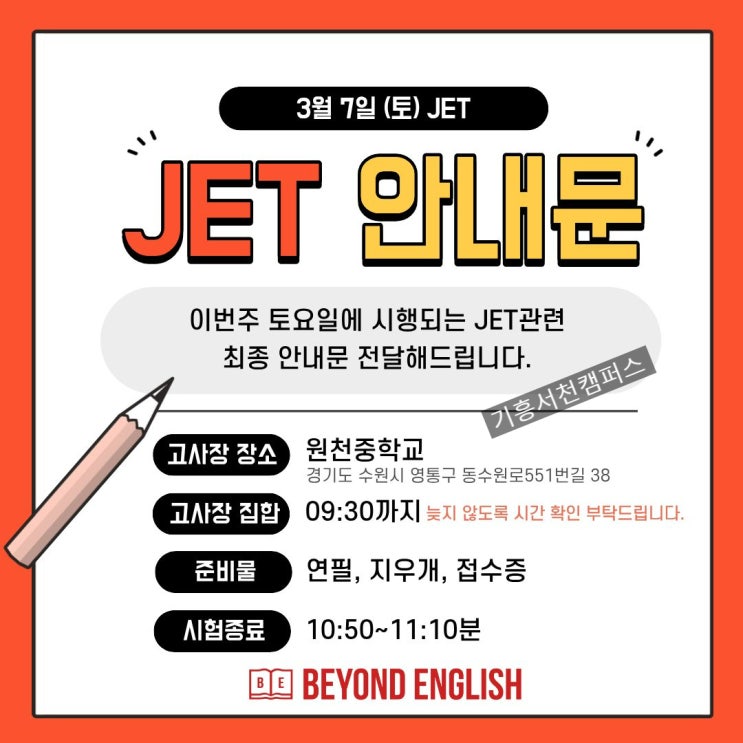 안녕하세요. 결과가 다른 영어 비욘드잉글리쉬 기흥서천캠퍼스입니다. 3월 7일 토요일 우리 비욘드 기흥서천 친구들이 JET 시험을 응시합니다. 우리 친구들이 부지런히 일찍 입실해서 편안하게 시험에 응시할 수 있도록 학부모님께 협조 부탁드립니다.^^ 우리 아이가 영어학원을 다니고 있다면, 현재 영어를 배우고 있다면, 정확하게 제대로 배우고 있는지 객관적이고 정확한 영어실력을 측정하고 학업 성취도를 평가해야 합니다. JET 시험이란? JET (Junior English Test)는 JET는 YBM에서 주관하는 초•중학생을 위한 영어인증시험으로 초·중등 영어 학습자의 Listening & Reading 능력을 평가합니다. 일상생활 속 영어 이해력을 중심으로....... <img src="https://blogthumb.pstatic.net/MjAyNjAyMjRfMzkg/MDAxNzcxOTE4ODgwOTAx.SROOlI3fAtyBoJTO7IdT6ZS0em3VReFFDS8imZa0wtsg.p0bUuoixR_Gx_XbMMGjRONEwGr2L25XhGNHWg6g92PEg.JPEG/JET%BE%C8%B3%BB%B9%AE_060307.jpg?type=s3" />