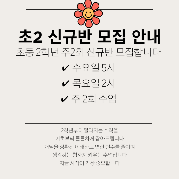 안녕하세요 화,목 5시 수업이 마감되어 수5시,목2시 수업으로 새롭게 개설됩니다 신규반은 새로 시작하는 친구들에게 딱인 수업으로 수업에 관심을 주셨다면 3월부터 함께해요 교과 개념을 정확하게 다지고 연산과 사고력을 함께 잡는 수업입니다 소수 정원으로 진행되며 집중도 높은 밀도 있는 수업이 이루어집니다 선등록 순 마감 예정입니다 관심 있으신 학부모님은 문의 주세요 <img src="https://blogthumb.pstatic.net/MjAyNjAyMjNfMTkg/MDAxNzcxODU1NzkyOTI4.5XYYfZWMYjnr7Yv8feqClMblyxI9VQ6d2zvzScbwiScg.RjpF2qVPIf3oOxtbxb-WuTxbNLtD6rwI1f64L90E_Skg.PNG/900%A3%DF%B7%B9%B5%E5_%BA%A3%C0%CC%C1%F6_%BD%C9%C7%C3%C7%D1_%B0%F8%C1%F6%BB%E7%C7%D7_%C0%CE%BD%BA%C5%B8%B1%D7%B7%A5_%B0%D4%BD%C3%B9%B0%A3%DF20260223%A3%DF230420%A3%DF0000.png?type=s3" />