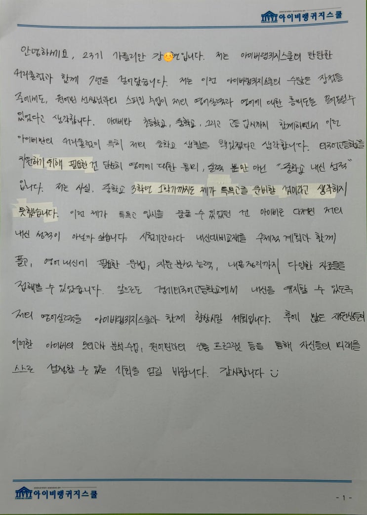 [아이비영어학원]7년의 믿음, 꿈을 현실로 만들다" 졸업생들이 직접 쓴 감동의 자필 후기 공개[동탄영어학원][반송동영어학원]