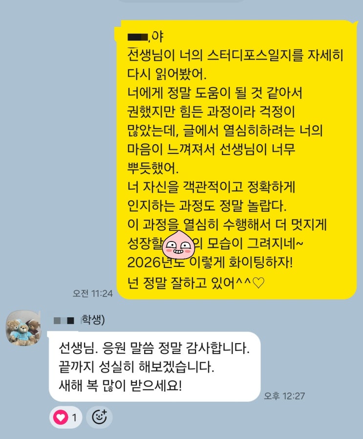 동탄 리드인 독해포스로 성장하다. 스터디포스를 진심으로 해내고 있는 한 중학생 친구가 있습니다. 누가 봐도 뛰어난 아이는 아니지만, 누구보다 간절하고 성실한 아이입니다. 이 친구는 매일 같은 시간에 와서 2시간씩 몰입합니다. 누가 강요한 것도 아니고, 보여주기 위한 것도 아닙니다. 자신이 세운 하나의 목표 독해력 올리기에 집중합니다. 메타인지를 시켜주는 기록 독해포스 훈련이 끝나면 ‘훈련 노트’를 씁니다. ✔ 오늘 얼마나 집중했는지 ✔ 어떤 부분이 이해가 어려웠는지 ✔ 내일은 무엇을 보완해야 하는지 ✔ 지금 나는 어떻게 성장하고 있는지 열심히 기록합니다. 지치는 날에도 자신의 흔적을 차곡차곡 쌓습니다. 기록은 마음....... <img src="https://blogthumb.pstatic.net/MjAyNjAxMDFfMTY0/MDAxNzY3MjUxMjM5Mzkz.pcGSnL5vYApPD8wIAEEn7X9SW0r9rNmH3w8Mga1Hyz0g.Zhk6o80Hn3qt9yIgy7-DWoWz616WY0Ie9fTqzqXymIMg.JPEG/KakaoTalk_20260101_143924050.jpg?type=s3" />
