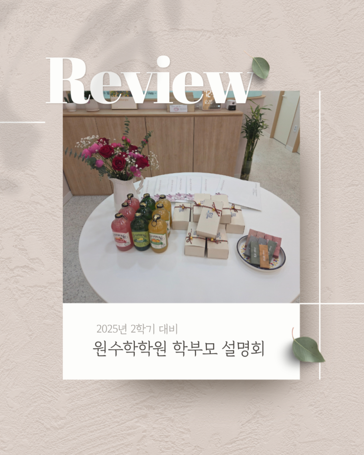 안녕하세요, 원수학학원입니다. 어느덧 가족들끼리 따뜻한 정을 나누는 설을 앞두고 있는 시점입니다. 저희 원수학학원에서는 앞서 공지드렸던 학부모 설명회를 성황리에 마쳤습니다. 이번 학부모 설명회에서는 저희 원수학학원의 2025년 하반기에 어떻게 학생들의 학업을 도왔고 2026년 신학기 대비 어떠한 방식으로 학습효과를 높일 것인지에 대해 진행했습니다. 초등부, 중등부, 고등부 선생님들께서 직접 학원과 담당하시는 반의 전반적인 시스템과 수업 방식, 그리고 방학·학기중·시험기간 등 각 시기별 맞춤 수업 전략에 대해 자세히 설명드리고 질문을 받는 방식으로 진행하였습니다. 또한 전문임상심리사이신 심리상담연구소 위로의 대표....... <img src="https://blogthumb.pstatic.net/MjAyNjAyMTBfMiAg/MDAxNzcwNjkyMDg4NTc0.JhpqQqeCNSWwKsjhjn-Q-jDhBtk7w6OAMrOPIC1P3Wsg.26MruVbNxww728UzzWxEkhWLp8KAPxrn4vwVSPVw6IEg.PNG/image01.png?type=s3" />