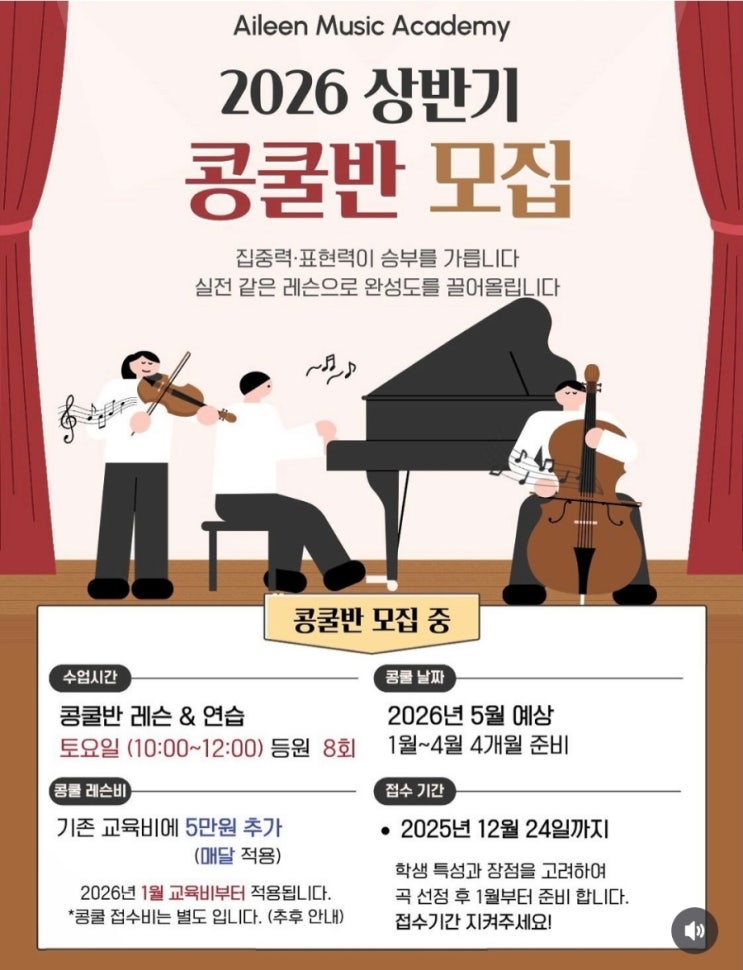 에일린 바이올린 2026년 상반기 콩쿨반 신청 안내드립니다. 참가 요건과 상세 내용은 아래 내용을 참가해주세요❤️ #옥정동음악학원 #에일린음악학원 #옥정바이올린 #옥정피아노 #옥정음악학원 #옥정동차량운행 #옥정초등학교 #연푸른초등학교 #옥빛초등학교 #호수초등학교 #옥정동최고의음악학원 <img src="https://blogthumb.pstatic.net/MjAyNjAyMTlfNDQg/MDAxNzcxNDU0MjEyMTA2.PmpdhPHdRLmKNGxGslF5nOk7prv2sbkk3yTO9TeKfLgg.QQAHNNoM4elWZMSvbVauMBvBadTq6X4PiarkQugedh4g.JPEG/900%A3%DFScreenshot%A3%DF20260219%A3%DF073206%A3%DFInstagram.jpg?type=s3" />
