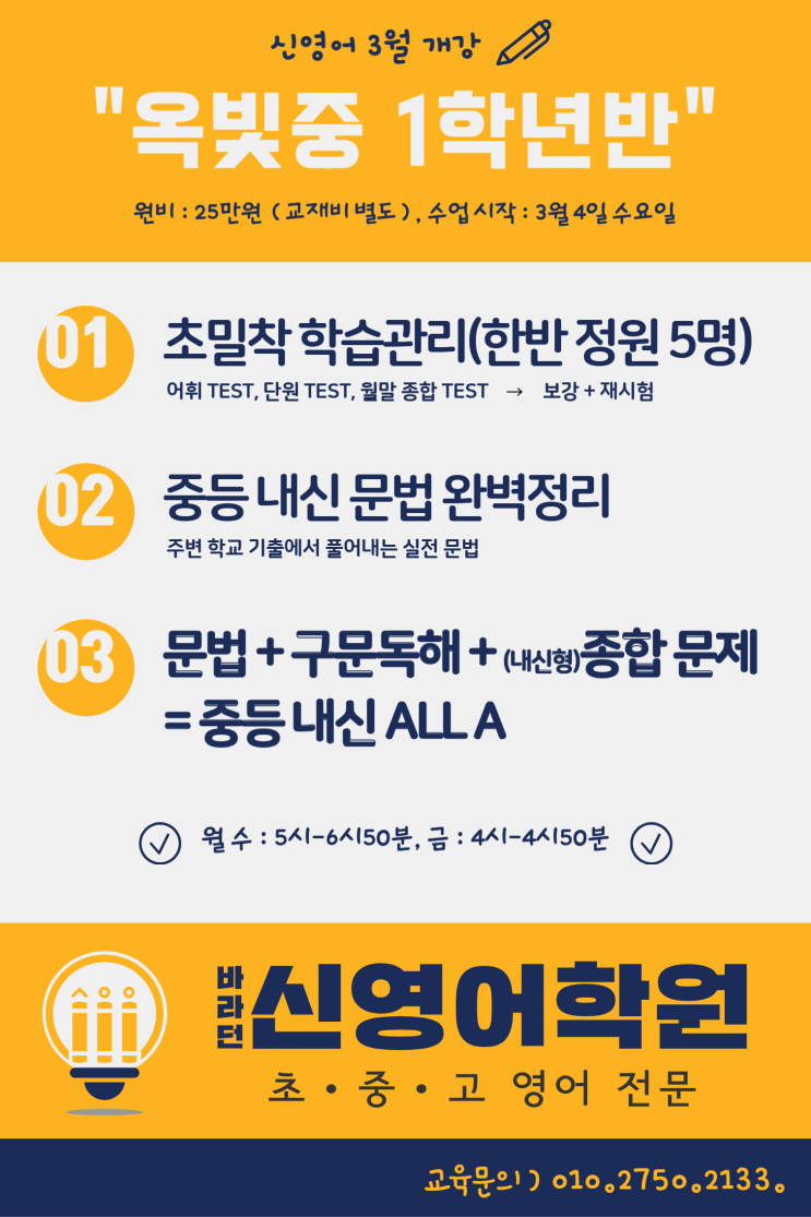 영어 실력, 3월에 결정됩니다. ✔ 작년 3월, 파닉스도 완성하지 못한 학생이 입학했습니다. ✔ 8개월 후, 첫 학교 시험에서 단 한 문제만 틀려 95.5점을 받았습니다. 이 차이는 시작 시점의 차이였습니다. 3월은 새 학년 시작 진도 차이가 벌어지기 전 기초를 바로 세울 수 있는 마지막 골든타임 지금 시작하면 중학교 3년이 편해집니다. 늦게 시작하면 따라잡는 시간이 더 오래 걸립니다. ✨ 영어, 이번 3월이 기회입니다. 010.2750.2133 으로 문자 주시면 답변 드립니다. <img src="https://blogthumb.pstatic.net/MjAyNjAyMTlfNzAg/MDAxNzcxNDczMzEyMDg4.zAtU17Z7hl3MI2cLJHrit6txgQdk5lFj_6ikDMIhTmMg.RQcITlgLg6UxRfpb4ic99p1vEB-vr51XfNdXN4vma_Ug.PNG/%C1%A6%B8%F1%C0%BB_%C0%D4%B7%C2%C7%D8%C1%D6%BC%BC%BF%E4__%BA%B9%BB%E7%BA%BB-002.png?type=s3" />