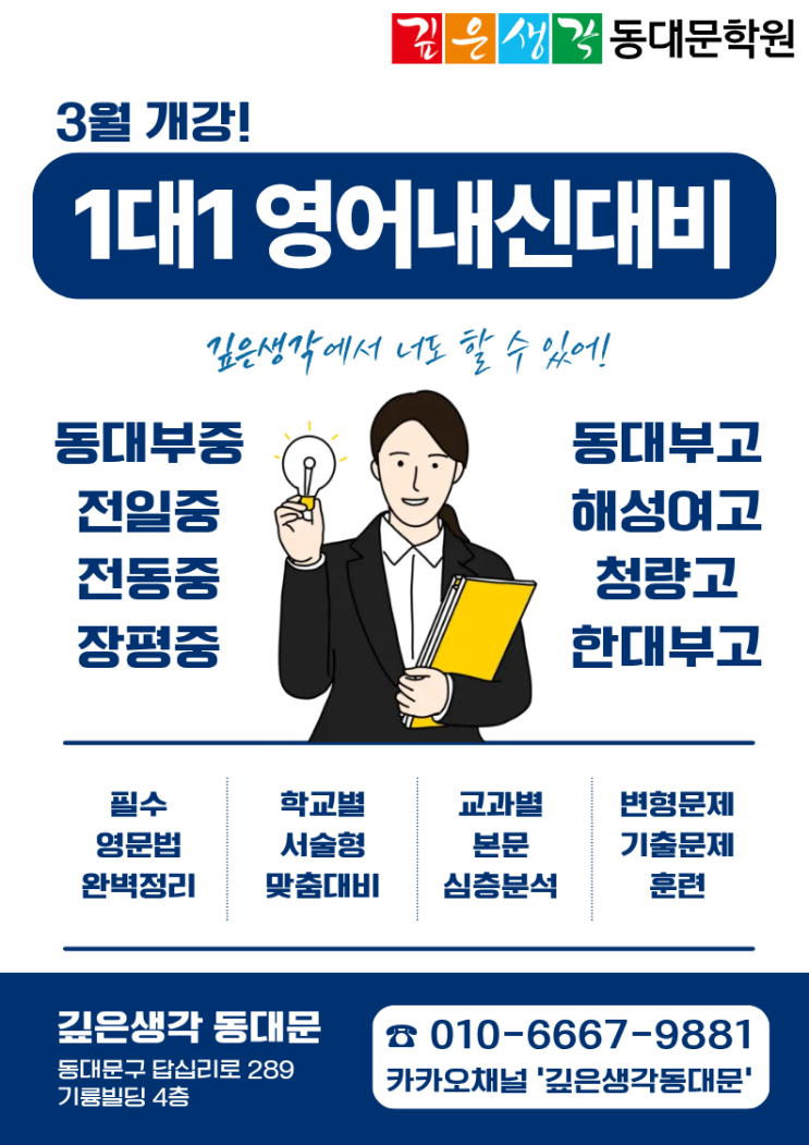 안녕하세요 깊은생각 동대문학원입니다. 이번 3월부터 새롭게 1대1 영어내신대비반을 운영합니다! <중학교 list> 동대부중 전일중 전동중 장평중 <고등학교 list> 동대부고 해성여고 청량고 한대부고 <1대1 내신대비반 특징> -필수 영문법 완벽정리 -학교별 서술형 맞춤대비 -교과별 본문 심층분석 -변형문제, 기출문제 훈련 등 1대1 맞춤형으로 철저하게 관리되는 과정으로, 수업 시간은 학생과 협의하여 운영되오니 관심 있는 분들은 전화나 카카오채널로 상담 부탁드립니다. 많은 관심 바랍니다:) <img src="https://blogthumb.pstatic.net/MjAyNjAyMTlfMjc2/MDAxNzcxNDg5NTAwMzQ0.yUf0BV7LlVfn9EMEYSfJyjywtUa40NIa8rFNnBCPzEkg.wODY7VNqxEReOZJNO5aELc0HQLAAUVB0F-XbvbA8yuIg.PNG/%B1%ED%BB%FD_%BE%C8%B3%BB%B9%AE_A4_%281%29.png?type=s3" />