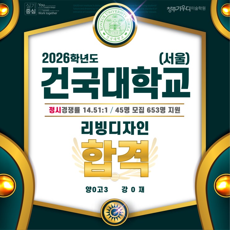 합격의 질이 다르다!! 수도권 대학 압도적 합격 결과! DESIGN GAUDI 안녕하세요~ 청주미술학원 가우디미술학원이에요~ㅎㅎ 2026학년도 정시 입시를 마치고 새 학년으로 월반 한지도 벌써 열흘이 지나고 있고, 내일부터 본격적인 민족의 대 명절인 설 연휴가 시작되네요ㅎ 짧은 연휴지만 잠시 쉬었다가 27학년도에 더 큰 목표를 향해 나아가야 할 것 같아요 ㅎ 오늘은 정시 결과를 가져왔는데요~ 건국대 2관왕 소식을 가져왔답니다.ㅎㅎ <나군> 리빙디자인 학과와 <다군> 산업디자인 학과 합격 소식인데요~ 2년 연속 <다군> 산업디자인 합격과 올해는 <나군>리빙디자인도 합격하는 쾌거를 이루었네요 ㅎ <나군> 리....... <img src="https://blogthumb.pstatic.net/MjAyNjAyMTNfMjg4/MDAxNzcwOTY4Mzc3OTQy.5bGWNrwEoz9lJ8RzCPr84YTvn2_FwlxSvlrmsbYQ-ZIg.5XBWCuL480rn9j18k9wtXKBdvT-zgVWFvQhX8_a05Uwg.JPEG/%C3%BB%C1%D6%B9%CC%BC%FA%C7%D0%BF%F8%2C%C3%BB%C1%D6%C0%D4%BD%C3%B9%CC%BC%FA%C7%D0%BF%F8%2C%C3%BB%C1%D6%B0%A1%BF%EC%B5%F0%B9%CC%BC%FA%C7%D0%BF%F8%2C%B0%C7%B1%B9%B4%EB%B8%AE%BA%F9%B5%F0%C0%DA%C0%CE%C7%D5%B0%DD.jpg?type=s3" />