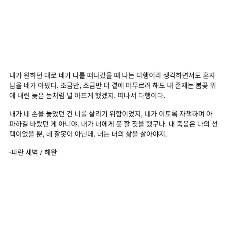 내가 원하던 대로 네가 나를 떠나갔을 때 나는 다행이라 생각하면서도 혼자 남을 네가 아팠다. 조금만, 조금만 더 곁에 머무르려 해도 내 존재는 봄꽃 위에 내린 늦은 눈처럼 널 아프게 했겠지. 떠나서 다행이다. 내가 네 손을 놓았던 건 너를 살리기 위함이었지, 네가 이토록 자책하며 아파하길 바랐던 게 아니야. 내가 너에게 못 할 짓을 했구나. 내 죽음은 나의 선택이었을 뿐, 네 잘못이 아닌데. 너는 너의 삶을 살아야지. -파란 새벽 / 해완 <img src="https://blogthumb.pstatic.net/MjAyNjAyMjJfMjIz/MDAxNzcxNjk3MDU5MzE1.ZgeePIEXbg13q96hOG_0U-EZ4D7J-Aw5XZ5pJp3vp1kg.mvuzky746D68qew6rbW5VqYBzIH1VLFjILaueOx3Emwg.JPEG/900%A3%DF20260222030357.jpg?type=s3" />