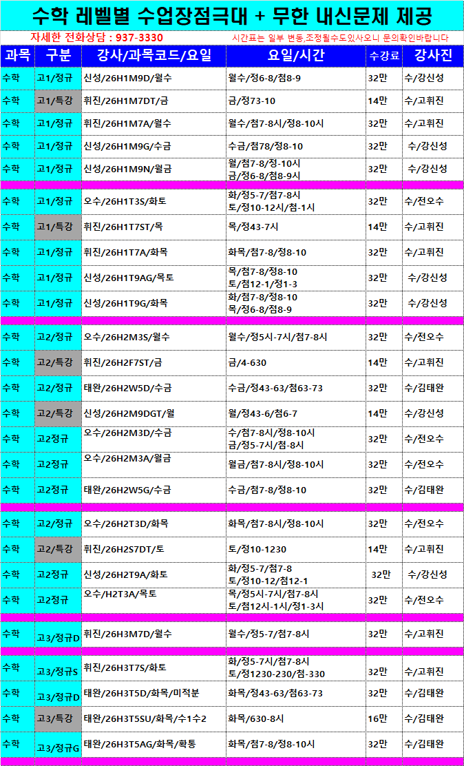 수학 시간표 안내 3월 최고수