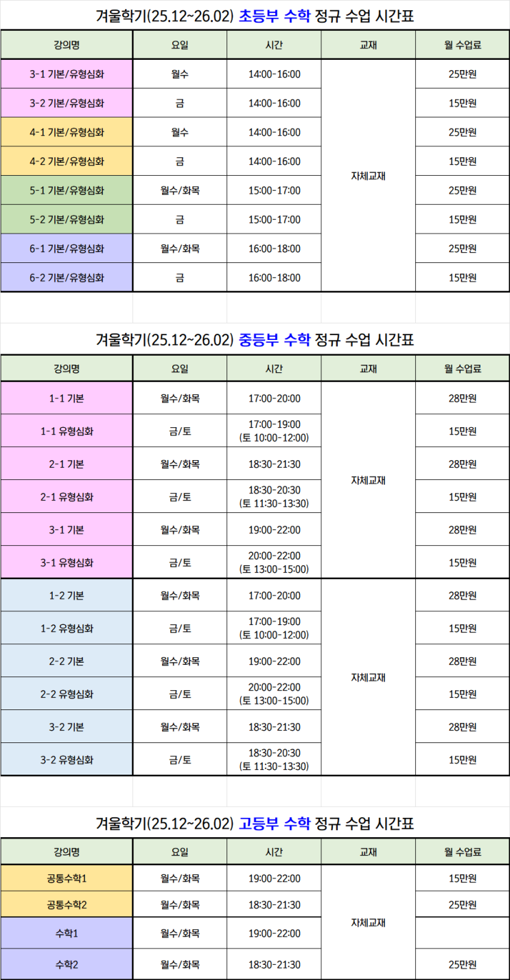 매년 연말 시즌이면 더함에듀학원은 바빠집니다. 다음 학기를 위해 이번 겨울방학에 어떤 수업을 개설해야 할지 검토하고 준비합니다. 26년의 더욱 큰 성장을 위해 고심하여 만든 수업 시리즈 첫 번째 겨울학기 수업 대개강 안내입니다. 기본과정과 선행과정, 유형 심화 최상위과정까지 원하는 학기와 과정을 골라서 수업할 수 있는 더함에듀학원 역시 학생들이 최우선인 더함에듀학원이 맞네요!!! 겨울학기 대개강 안내 (25.12~26.02) ▶ 개강일: 초등, 중3) 12월 1일~ 중1,2, 고등부) 기말고사 후~ 더함에듀 영어 시간표 올 겨울도 겨울방학을 뜨겁게 달굴 우리 재원생들의 열정이 기대됩니다. 혼자서는 힘들지만 함께는 더 빠르게 앞으로 나아....... <img src="https://blogthumb.pstatic.net/MjAyNTExMjdfMTE2/MDAxNzY0MjMzOTA4MjIy.mRiI8GIKXWZXRjK4zcEQYndX26yiUf4a802Lq7QEHZAg.VTD-C5SCXW4TaMrdQrGQaCfswNuou3Q1DruWLAZSW90g.PNG/25.%B0%DC%BF%EF%C7%D0%B1%E2%C0%BA%C6%F2.png?type=s3" />