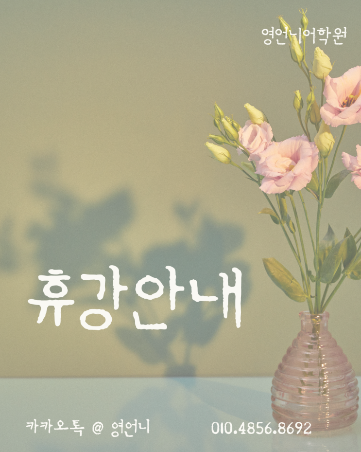 안녕하세요. 영언니 어학원입니다. 3월 공지사항입니다. 2월 26 – 3월 20 잠시 휴강을 하게 되었습니다. ⠀ 4월 수업은 3월 중순에 공지가 나올 예정입니다. 4월 강의 상담 기간 카카오톡 / 문자 상담 3월 9일 이후 전화 및 방문 상담 3월 16일 이후 (방문 상담은 예약 후⠀진행) ⠀카카오톡 @영언니 문자 010-4856.8692 감사합니다. ⠀ <img src="https://blogthumb.pstatic.net/MjAyNjAyMDhfNzkg/MDAxNzcwNTU4Nzg0MTQ1.pejiWyKbs0QzCVRF3xHWIiZn2-5tjYjMMhi6URSrJikg.egiA1TkeD4TxjcprawtrU5ySs6hDs1on-99uEoZb8Cgg.PNG/%C8%DE%B0%AD%BE%C8%B3%BB.png?type=s3" />