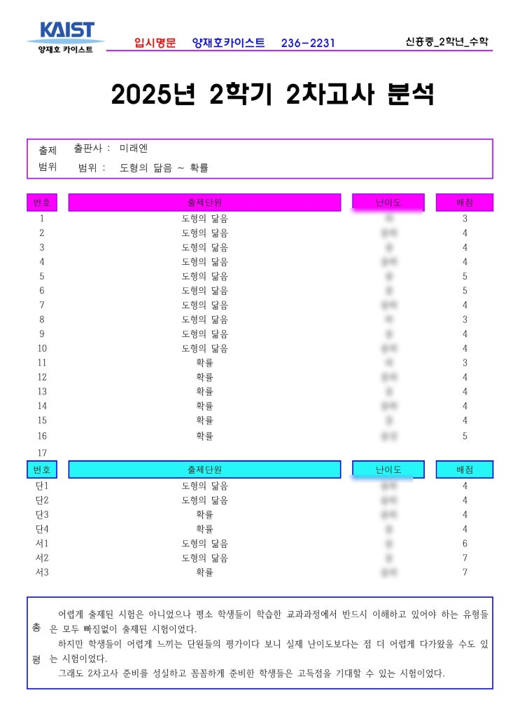 신흥중 2학년 2학기 2차고사 수학분석 전주 중★고등수학 상위권의 표본인 전주 수학학원 양재호카이스트학원입니다. 이번에는 전주 신흥중 2학년의 수학, 2025년 2학기 2차고사를 분석하여 보겠습니다. 위의 내용 중 난이도는 양재호카이스트학원의 내부자료입니다. 그런 이유로 블로그에서는 모두 공개할 수 없음을 양해바랍니다. 학원에 내원하시면 열람가능합니다. ^^ 중화산동 수학학원 양재호카이스트학원에서는 전주에 있는 중★고등학교의 기출을 항상 분석하고 기록으로 남기고 있습니다. 아직 시험을 보지 않은 학생들에게는 좋은 자료가 되고 또한 내년, 내후년에 후배들에게 많은 도움이 되기도 해서입니다. 그리고 시험직전에 시중....... <img src="https://blogthumb.pstatic.net/MjAyNjAyMTFfMjcw/MDAxNzcwNzk1MTM1NTgz.z8gt_oWVbU3FeV46pgAG72KpZcW2cpTtNIPQFsk75kAg.xhpHCc_o2YJ_sMKjU4loNgZj_swIvL9dRI69qo52hnog.JPEG/%BD%C5%C8%EF%C1%DF2.jpg?type=s3" />