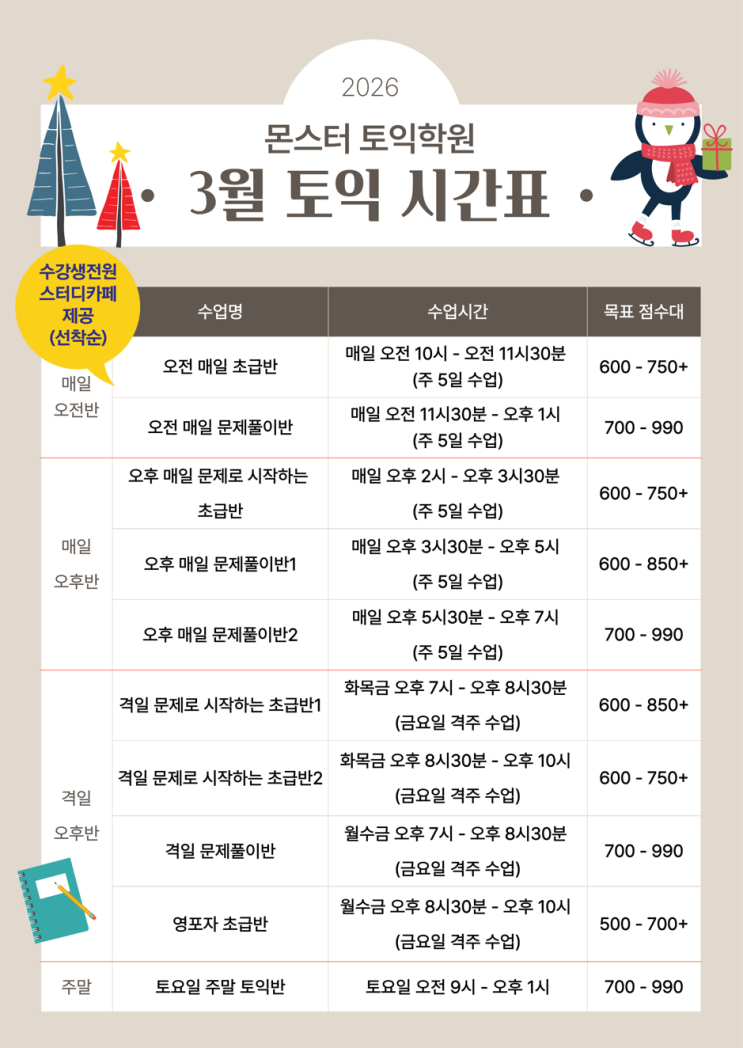 [유앤박어학원] 3&4월 수업 시간표 공지