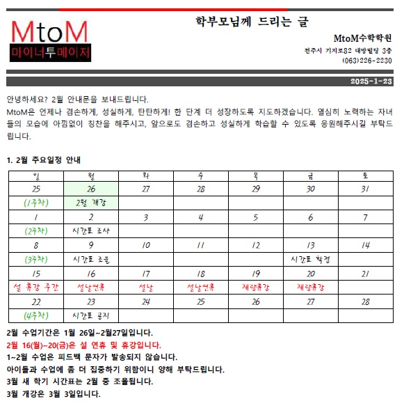 [전주엠투엠수학학원] 2월 안내문