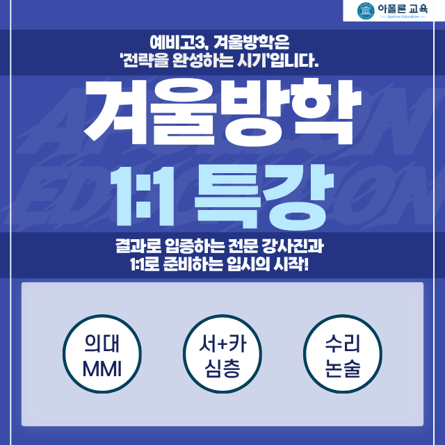 ■겨울방학 ■자소서/면접/논술 특강■ 고3을 앞둔 겨울방학, 서두를 필요는 없습니다. 대신, 제대로 시작해야 합니다. 학생마다 다른 목표와 전형, 그에 맞춘 커리큘럼으로 준비합니다. 결과로 증명해온 아폴론의 겨울방학 특강입니다. [겨울방학 1:1 특강] https://www.apolloneducation.com/200 ▶의대 MMI 면접 1:1 특강 의대 MMI에서 요구하는 사고 구조와 답변 틀을 완성하는 대학 맞춤형 이론+실전 1:1 수업 * 평가영역 및 문제 접근방식 이해 * 대학별 MMI 유형 분석 및 기출문제 집중 대비 * 최근 3개년 의료 이슈 기반 실전 적용 ▶서+카 심층면접(수학/물리/화학/생명) 1:1 특강 서울대+KAIST 기출문제 완벽분석 + 빈출 핵심개념 정리....... <img src="https://blogthumb.pstatic.net/MjAyNjAxMjZfODcg/MDAxNzY5NDA0NTA2MTI3.Q38xB1mEQMhELZIj44q7dgwr0dLYDNMH43P5m0njdhUg.42e0jsGrY68iHAeD0T4BCzbpTMx-mCn5QPB7886CoT4g.PNG/%C1%A6%B8%F1%C0%BB_%C0%D4%B7%C2%C7%D8%C1%D6%BC%BC%BF%E4._%2837%29.png?type=s3" />