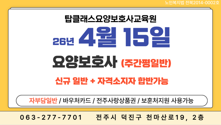 나이많은 내가 취업은 할 수 있을까? 내 건강과 가족건강은 내가 배워서 책임진다! 나의 노후는 어떻게 그려질까? 궁금하다면? 전주에서 수강평이 제일 좋은 곳! 탑클래스 간호학원/요양보호사교육원에서 고민을 함께 나눕니다 ✅ “자격증 따고 나서 뭐 하지?” 걱정 끝! ✅ “경력 없는 나도 교육생이 될 수 있을까?” 걱정 그만! ✅ “교육비·시간이 너무 버겁지 않을까?” 방문상담으로 확인해보세요! 내수 부진과 초고령화에 취업자 1위 업종 식당→간병인·요양보호사 제3차 장기요양계획 2023-2027에 따르면 요양보호사 간병인력은 절대적으로 부족합니다. 27년 7.5만명 부족 전망치보다 더욱 부족할것으로 보입니다. 탑....... <img src="https://blogthumb.pstatic.net/MjAyNjAyMjBfMjM2/MDAxNzcxNTY3Mjc2Mzc5.MlAPmuW-YBZELQN5mq8xyaqcZP7-c0jEuULNRb4hCsUg.EI6xCT3xD_6HxmWx2b-JrxXtKial7Jy7lPjF4pbutUEg.PNG/image.png?type=s3" />