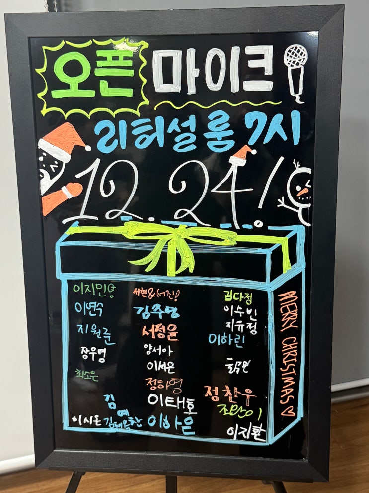 안녕하세요 잼 실용음악학원 입니다 :) 지난 12월 24일, 크리스마스 이브 날의 따뜻한 분위기 속에서 오픈마이크가 진행되었습니다. 무대 경험이 처음인 학생부터, 오랜만에 관객 앞에 서는 학생까지 각자의 마음과 음악을 담아 한 곡 한 곡 소중하게 무대를 채워준 현장을 같이 구경 가볼까요~?? . . . [인천실용음악학원/잼실용음악학원/인천보컬학원] 기존 오픈마이크 진행했을 때는 제비뽑기로 슨서를 정했는데 이번엔 특별히!! 저 순서대로 진행을 했답니다! (이 전까진 우리 친구들은 모르고 마음대로 썼다는 사실..ㅎ) 이번에도 역시 진행은 우리 산타 강태헌 팀장께서 해주셨답니다!! 크리스마스 특집으로 진행된 만큼 복장도 산타, 크리....... <img src="https://blogthumb.pstatic.net/MjAyNjAxMDJfMTg5/MDAxNzY3MzMwMDY2MTQy.H80p-u7qhd8IjFnUuOdIjPh3HLm9p0kgjZ_ImY6IPv4g.W1VaPiFd34NgMRUCgei_mC13jmNwc9DJXsRUtCiBuM8g.JPEG/KakaoTalk_20260102_133225176_25.jpg?type=s3" />