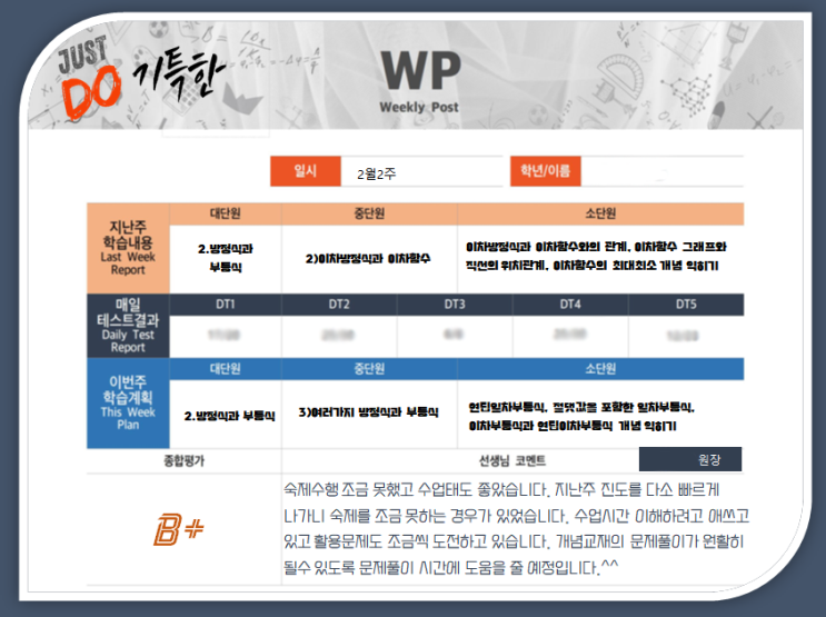 이번 주는 방학 동안 여행이나 가족모임으로 해이해진 학습 습관을 바로잡는데 집중했습니다. 학습의 긴장감을 줄 수 있도록 진도를 아이에 맞춰 속도를 올렸는데요. 매주 꾸준히 나가는 것도 물론 중요하지만 아이가 버거워 하지 않는 선에서 조절하는 것이 선생님의 역량입니다. 지난주 학습 점검 지난주 긴 여행으로 학습 공백이 생겨 다시 공부 페이스를 다져야 할 시기였는데요. 이틀 동안 수학의 감을 되살리고 나머지 3일은 진도를 빠르게 진행했습니다. 아이마다 수학의 감을 되살리는 시간이 다르기 때문에 마음만 앞서지 않도록 조심해야 합니다. 이번 주 학습 내용 지난주 많이 나간 진도를 소화하고 있는지 하루는 점검하고....... <img src="https://blogthumb.pstatic.net/MjAyNjAyMTJfMjcx/MDAxNzcwODc5NDU3MTI4.ED-T5--kKrisyXalVvLoGp99gThW98UFFxpSxl74oLsg.TQIyPh1rJoeSMzf4Axx419O-0G66M5l7NI2MkE9TUqUg.PNG/%C0%A7%C5%AC%B8%AE%C6%F7%BD%BA%C6%AE%B0%ED1_%BB%E7%BA%BB.png?type=s3" />