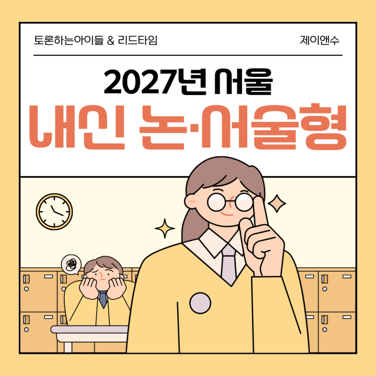 2027년부터 서울 내신 평가의 중심이 논·서술형으로 이동합니다. 단순한 문제 풀이보다, 생각을 글로 표현하는 힘이 핵심이 됩니다! 평가 방식이 바뀐다는 것은 아이에게 요구되는 학습의 기준 자체가 달라진다는 뜻입니다 지금의 준비가 2027년까지 이어질 수 있는지 점검이 필요한 시점입니다. 지금까지 잘하던 문제풀이만으로 미래의 내신이 안정적일 수가 있을까요? 생각을 정리하고 설명하는 힘은 하루아침에 만들어지지 않습니다 이제 평가는 시험지 위가 아니라 수업시간의 모든 순간에서 이루어집니다. 아이의 말하기, 사고 과정, 표현 태도가 그대로 결과가 됩니다! 읽고, 생각하고, 말하고,쓰는 힘은 따로 뗴어 연습할 수 없는 능력입....... <img src="https://blogthumb.pstatic.net/MjAyNTEyMzBfMTI5/MDAxNzY3MDczMzkwMzAy.5nPYVe6vqgNm8_bY2J0VMHBuP1nFUT7Fe8wiLGcXq8kg._mT237Dnm_KyKykiHSEbFpZs-rn2G1y_jxjLWkJMsWsg.PNG/1.png?type=s3" />
