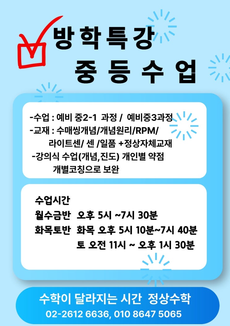겨울방학을 맞이하여 다음과 같이 방학특강을 합니다. 추운 겨울을 뜨거운 학구열로 녹여봅시다 상담문의 02 2612 6636 010 8647 5065 수학이 달라지는 시간 -정상수학 입니다.!! <img src="https://blogthumb.pstatic.net/MjAyNjAxMDVfODYg/MDAxNzY3NTk3NTI1MTg2.HiTW4C7NxNWjsVYDyETrAwo4g2-Xd4MT0OoK81U93kQg.7uWpc8L7IoVqQ7zPT1tqtfrp_JpMOwy7FplcqNnxdkYg.JPEG/%B9%E6%C7%D0%C6%AF%B0%AD_%C1%DF%B5%EE.jpg?type=s3" />