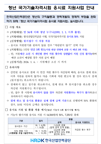 ㅇ (지원대상) 만 34세 이하 청년 누구나(1991. 1. 1. 이후 출생) ㅇ (지원내용) 한국산업인력공단 시행, 국가기술자격시험 응시료 50% 지원 ㅇ (신청방법) 원서접수 시 자동 적용 - 응시료 지원받기를 원하지 않을 경우 “지원받지 않기” 선택 가능 ㅇ (지원한도) 1인당 연간 3회 한도(지원 대상 연령에 포함 시 매년 3회 지원) - 단, 지원예산 소진 시 개인별 잔여 지원 횟수와 상관없이 지원 신청 불가능하며 예산 소진이 예상될 경우 사전 공지 예정 ㅇ (신청기간) 2026. 1. 6. ~ 지원예산 소진 시 까지 <img src="https://blogthumb.pstatic.net/MjAyNjAxMDdfNjYg/MDAxNzY3NzYyMzU5NTMy.r05gpyzeDmQWFxBBIt1GjwZqe_VruHg3eRHtX9Y4CQAg.Yn7lAduiP_T68RRDRI_tsIJ2jCBhlq0rXITSqQdjXncg.PNG/%C4%B8%C3%B3.PNG?type=s3" />