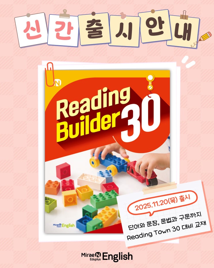 안녕하세요. 미래엔영어입니다. 미래엔영어의 단계별 독해 기초 교재 ‘Reading Builder 30·50·70’ 시리즈가 완간되었다는 반가운 소식을 전해드립니다. 이번 시리즈는 미래엔영어의 대표 다독 교재 Reading Town(리딩타운) 30·50·70의 학습 효과를 더욱 높이기 위해 개발된 선행·보완 독해 프로그램입니다. 본격적인 리딩 학습에 앞서 반드시 필요한 어휘와 문장 구조를 체계적으로 다질 수 있도록 구성되었습니다. 읽고, 이해하고, 표현하는 영어 미래엔영어는 파닉스부터 스토리 리딩, 심화 독해까지 자연스럽게 연결되는 체계적인 커리큘럼을 운영하고 있습니다. 특히 ‘읽고 이해하고 표현하는 영어’를 핵심 가치로 삼아, 단순 문제 풀이....... <img src="https://blogthumb.pstatic.net/MjAyNjAyMjBfMjIy/MDAxNzcxNTY0NTE3MTUw.St7AnzC8jgnsKlIKtufj3ECWNrhzDNrkdC3L8_yE0Fcg.unFakwdV3WWEvQIsBP2DPvKA4dUnzYQ_9Ej-zQwRj3Yg.JPEG/1.jpg?type=s3" />