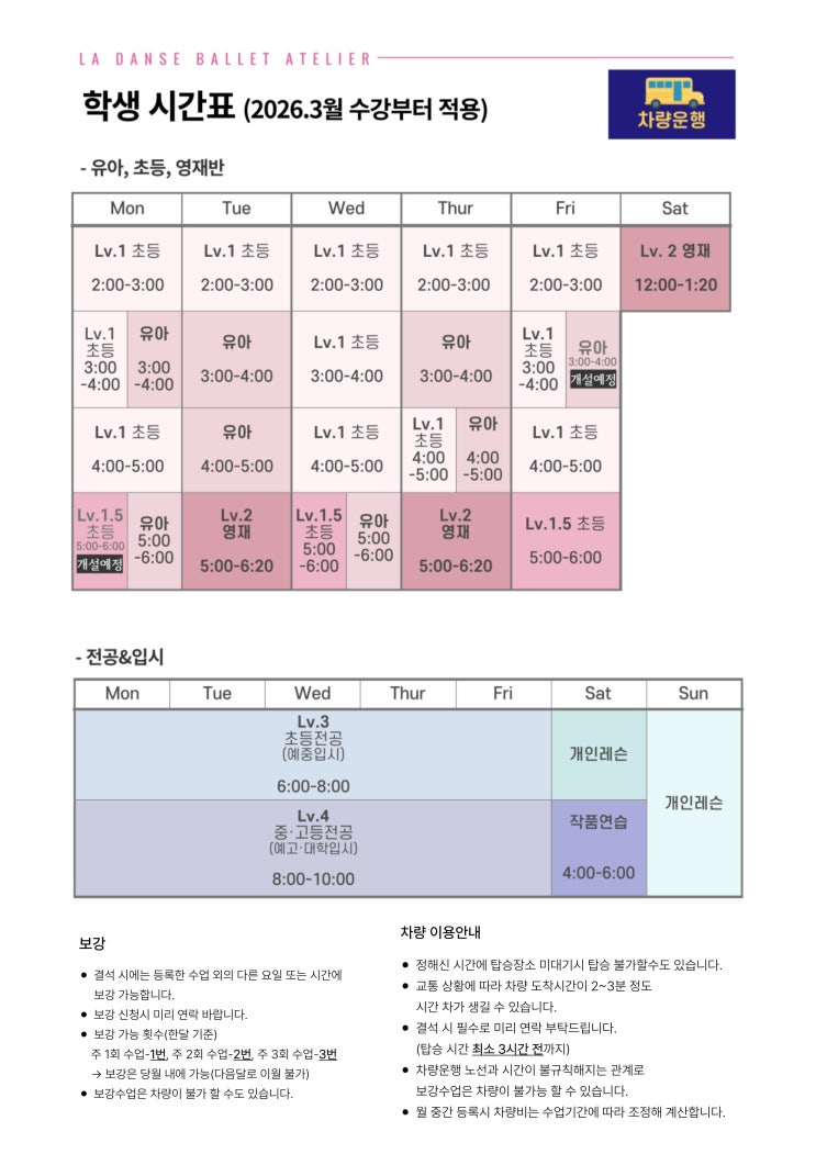 학생&성인발레 시간표 월요일 초등발레 1.5레벨(5시) & 금요일 유아(3시)는 인원모집시 개강예정이므로 참고부탁드립니다. 수업 전(약 30분전) : 발레수업에 적합한 복장으로 준비하고, 충분한 스트레칭 및 워밍업을 해주세요. 수업 후 : 빈홀에서 개인연습 및 로비에서 쿨다운(마무리 스트레칭)을 통해 근육을 회복시켜 주세요. 선생님의 판단에 따라 보충연습이 이뤄질수도 있습니다. <img src="https://blogthumb.pstatic.net/MjAyNjAyMjJfODEg/MDAxNzcxNzYyMTI0ODc0.EKAX_xNhWR6hrTfuZJwyzKW6rye4Q06m3oW7AY-8Pygg.DQDPzpfjX-oqAH5eFFB6in0HjBDHZnG5z6dfP4fybQkg.JPEG/%BD%C3%B0%A3%C7%A5-002.jpg?type=s3" />