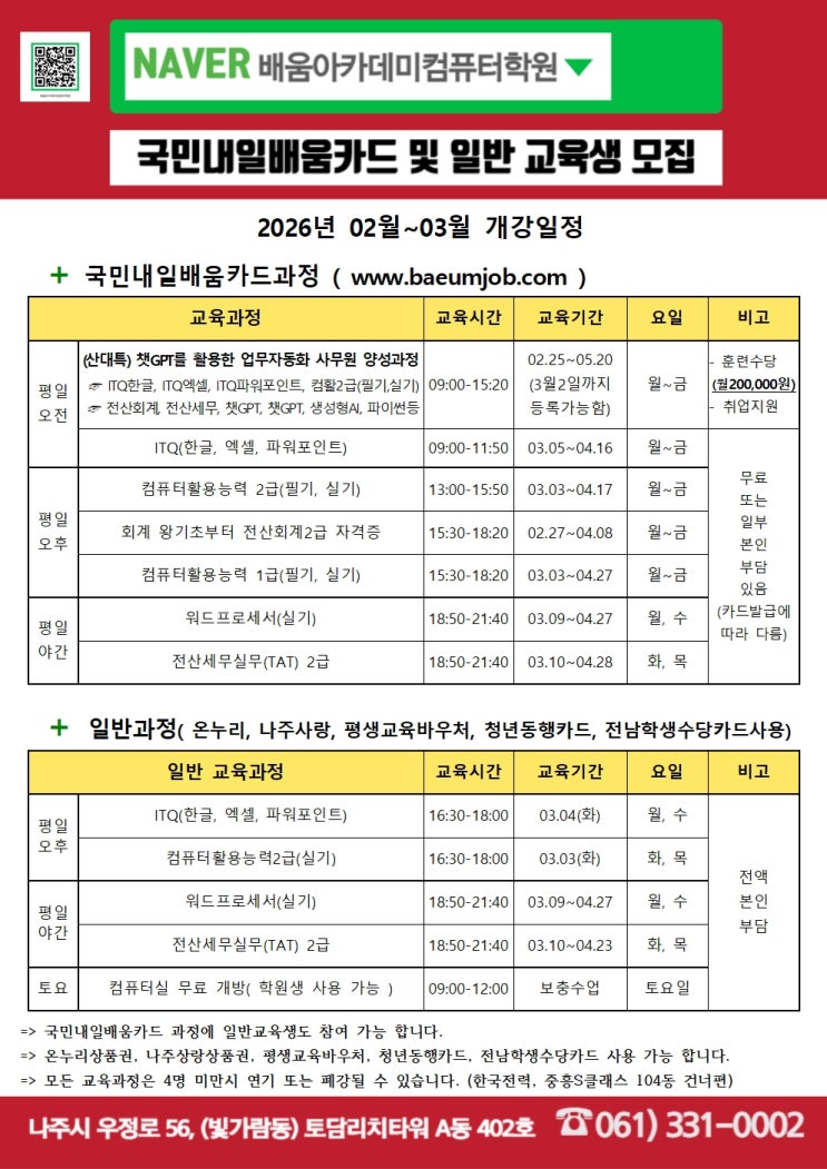 2026년 02~03월 국민내일배움카드 및 일반교육생 모집합니다 학원상담문위 : 061-331-0002 <img src="https://blogthumb.pstatic.net/MjAyNjAyMTlfMjg1/MDAxNzcxNDY1MTc1MTAy.4uqS5l9ozOc7PJOMj_RJhLcTkx0ExJyaFAgXkTDoxVMg.0BUMhajNbIaqDqDuAcMNb31sOCMMaXfE4zpZ7DIHUoMg.JPEG/2026%B3%E2_%B9%E8%BF%F2%BE%C6%C4%AB%B5%A5%B9%CC%C4%C4%C7%BB%C5%CD%C7%D0%BF%F8%2802%BF%F9_%B0%B3%B0%AD_%BD%C3%B0%A3%C7%A5%29001.jpg?type=s3" />