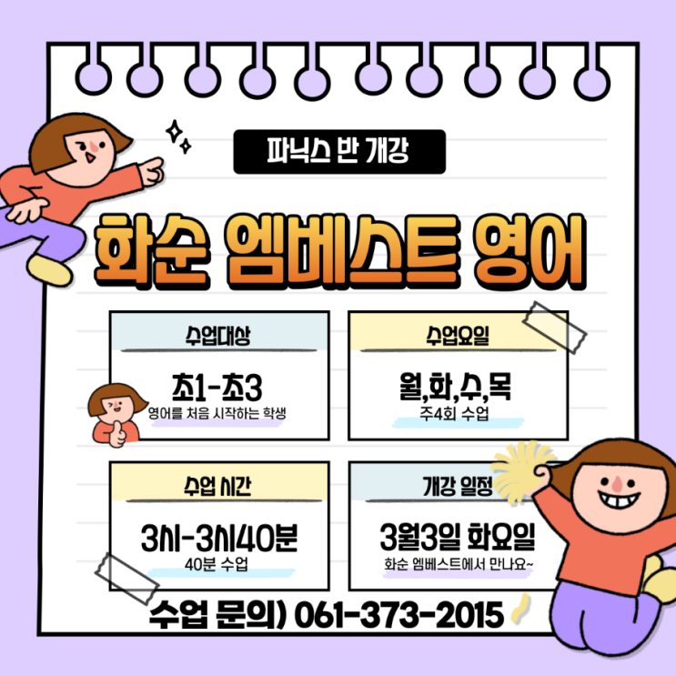 화순 엠베스트 영어에서 파닉스 반을 모집합니다~! 수업 문의) 061-373-2015 <img src="https://blogthumb.pstatic.net/MjAyNjAyMTBfMjQ5/MDAxNzcwNzI1MjIyMDk1.KBOspnY4QO3gPZl4PQWhTWKDiS3lRQP7iQdtTH1j8m8g.V4wPLiTwXMMCbLJWa1evTEKKv6lmSvxNllB-Gh8FvPkg.PNG/900%A3%DF1770722719638.png?type=s3" />