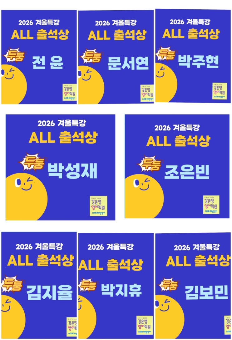 안녕하세요! 행복한 강쌤입니다 다들 겨울방학 알차게 보내셨나요? 저희 중등학생들은 5주간 문법특강에 참가했답니다. 각 학년별로 책 한권의 개념을 모두 훑어보는 코스였지요! 이렇게 해두면 한 학년이 너무 편해진답니다. 처음 대하는 문법 개념이 아니니 다들 대하기가 편해지죠~ 본 학습과 병행하여 1시간의 특강까지 정말 열심히 겨울방학을 불태웠네요 내일은 드디어 5주간의 특강을 마무리하는 시간입니다. 열심히 해준 우리 아이들. . 그냥 지나칠수없죠. 5주간 하루도 결석없이 참여해준 친구들을 위해 하나하나 카드뉴스를 만들었어요. 내일 전자칠판에 하나하나 띄우고, 간단하게 선물과 함께 축하하는 시간 가지려합니....... <img src="https://blogthumb.pstatic.net/MjAyNjAyMTJfMTAw/MDAxNzcwODk4OTc5OTU4.5un4FPSQdnQztDjXAD0tYX99Oi6bbbCg7hr6AbVmPfgg.PqQgJ5bkHBhRvWeLx0xxsGIjHZlLdxA9ty8R_RNdvxgg.JPEG/7A0E2C19%A3%ADFCBF%A3%AD45FA%A3%ADA3A4%A3%AD61CAE1879B84%A3%AD38863%A3%AD00001243534CE1A6.jpg?type=s3" />