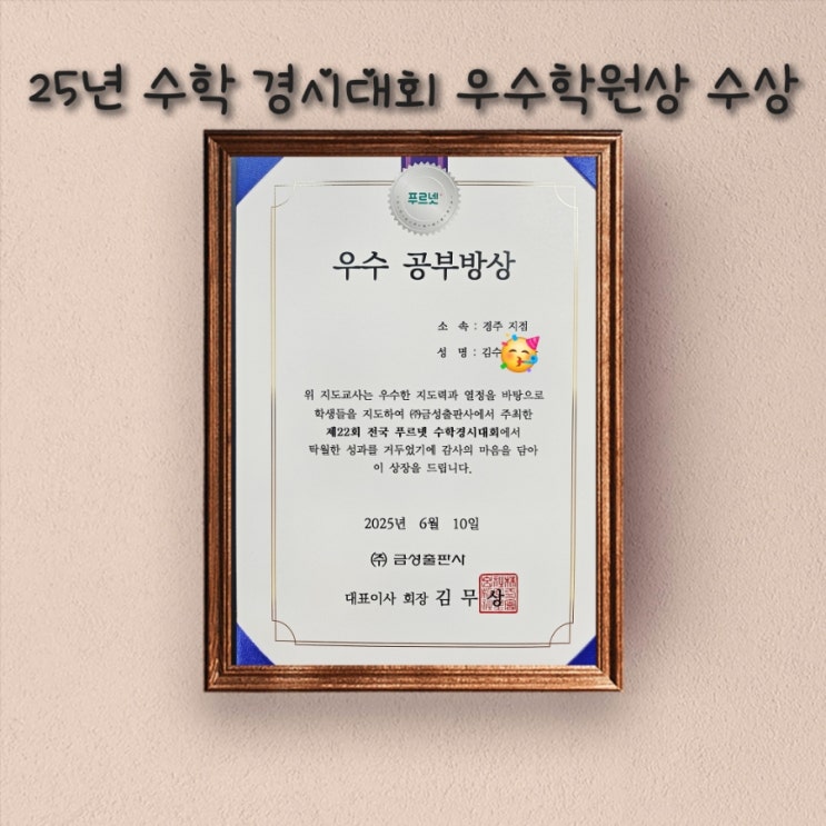 2025년 제22회 푸르넷 수학경시대회에서 많은 학생들의 도전과 우수한 성적으로 우수 학원 수상도 받게 되었던 상장과 축하 현수막사진입니다. 올해 2026년 푸르넷 수학경시대회 소식을 공지합니다. PMO 푸르넷 수학 경시대회는 초등학생을 대상으로 한 전국 단위의 경시대회입니다. 교과서 1위 기업 금성출판사에서 주최하는 경시대회인 만큼 학생들의 수학 능력을 검증하고 학업성취도를 높여 창의력과 학습의욕을 고취하고자 합니다. 푸르넷 수학경시대회에서는 심화 과정의 학습 능력을 키우고 이를 평가해 우수한 수학 인재 발굴의 계기가 되도록 하며, 이를 통해 학생들의 장.단점을 파악하여 체계적인 우수 교수법을 활용하고자 합니다. 금....... <img src="https://blogthumb.pstatic.net/MjAyNjAzMDhfOTIg/MDAxNzcyOTQwMzAxOTA3.jJMSv0KfZdSJP9OcyfOWeM99oC0k4VT6KNCBtHoocoEg.8k2yFW6FNwTLKNsG4MdQcqlWhkDTL7bQyzFcpazmS4kg.JPEG/900%A3%DFGridArt%A3%DF20260308%A3%DF104622236.jpg?type=s3" />